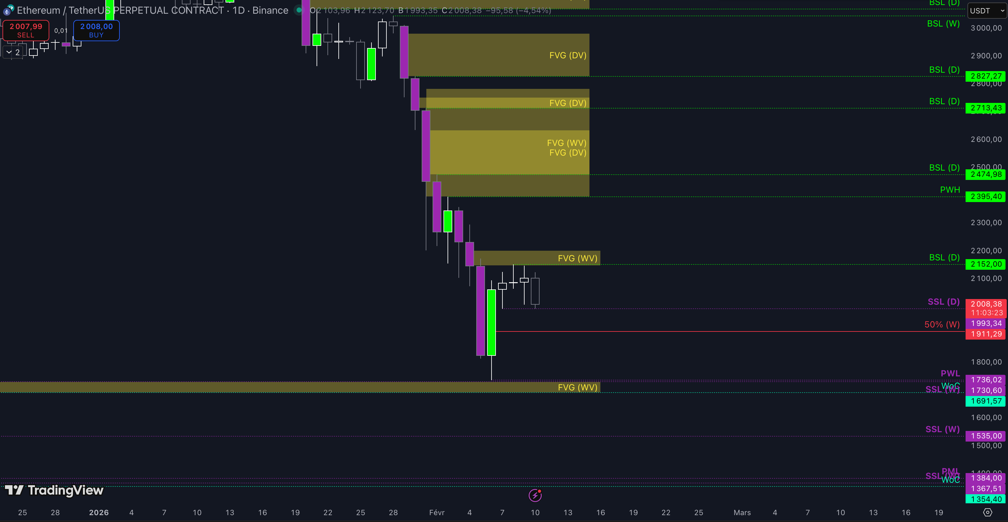 Tant que le niveau Ă 2.201 $ nâest pas cassĂ©, câest-Ă -dire quâaucune clĂŽture daily supĂ©rieure nâest validĂ©e, alors la dynamique restera baissiĂšre et les objectifs seront :