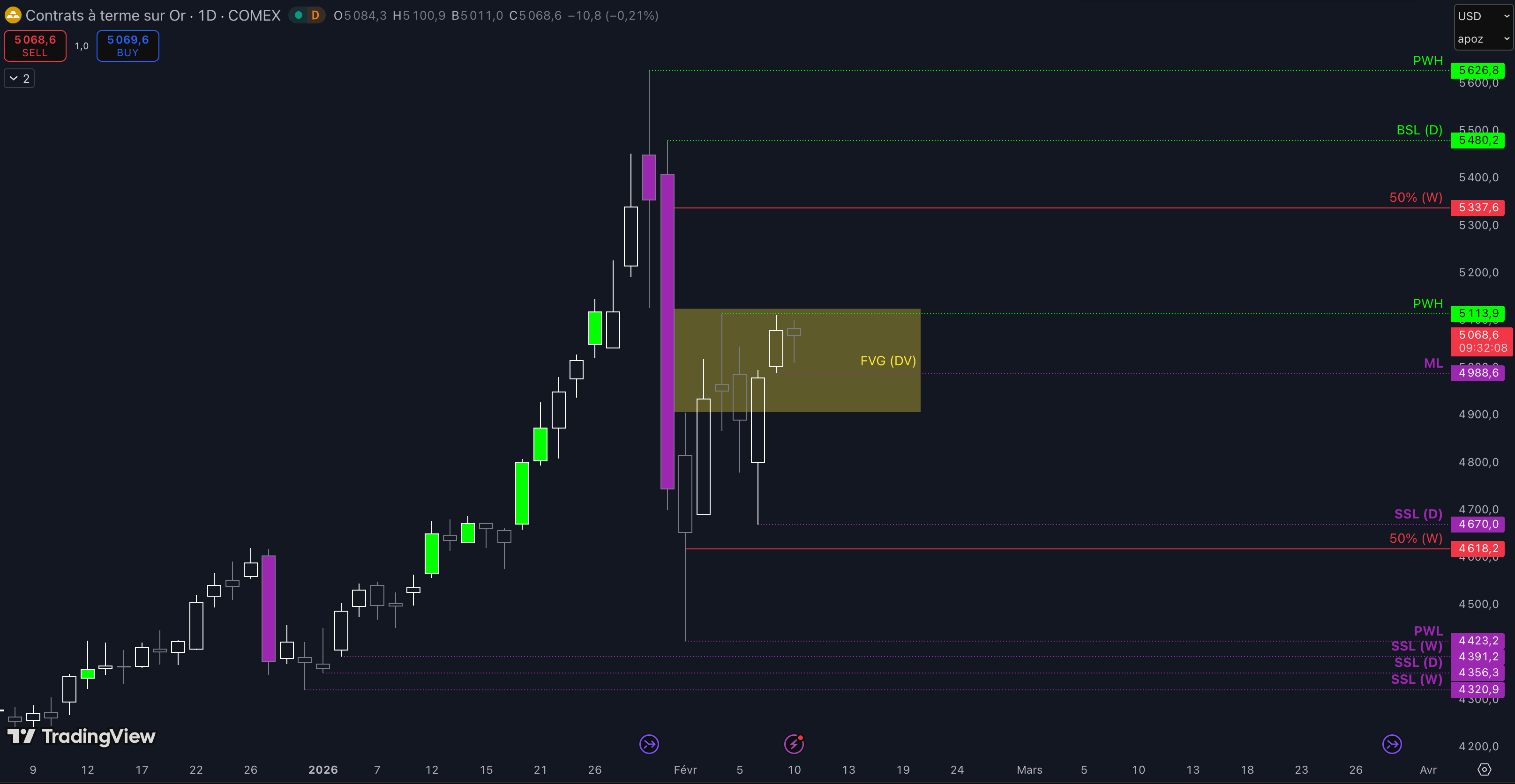 Tant que le niveau Ă 5.126 $ ne sera pas cassĂ©, câest-Ă -dire quâaucune clĂŽture daily supĂ©rieure nâest validĂ©e, alors la dynamique restera baissiĂšre Ă court terme et les objectifs seront :