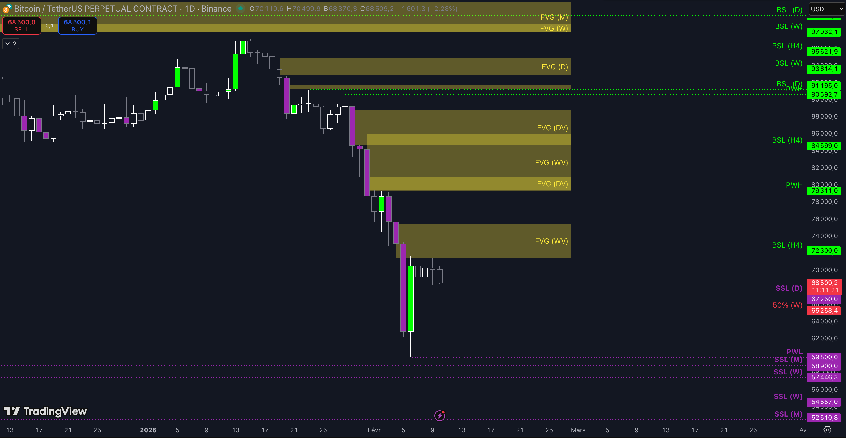 Tant que le niveau Ă 75.465 $ nâest pas cassĂ©, câest-Ă -dire quâaucune clĂŽture daily supĂ©rieure nâest validĂ©e, alors la dynamique restera baissiĂšre et les objectifs seront :