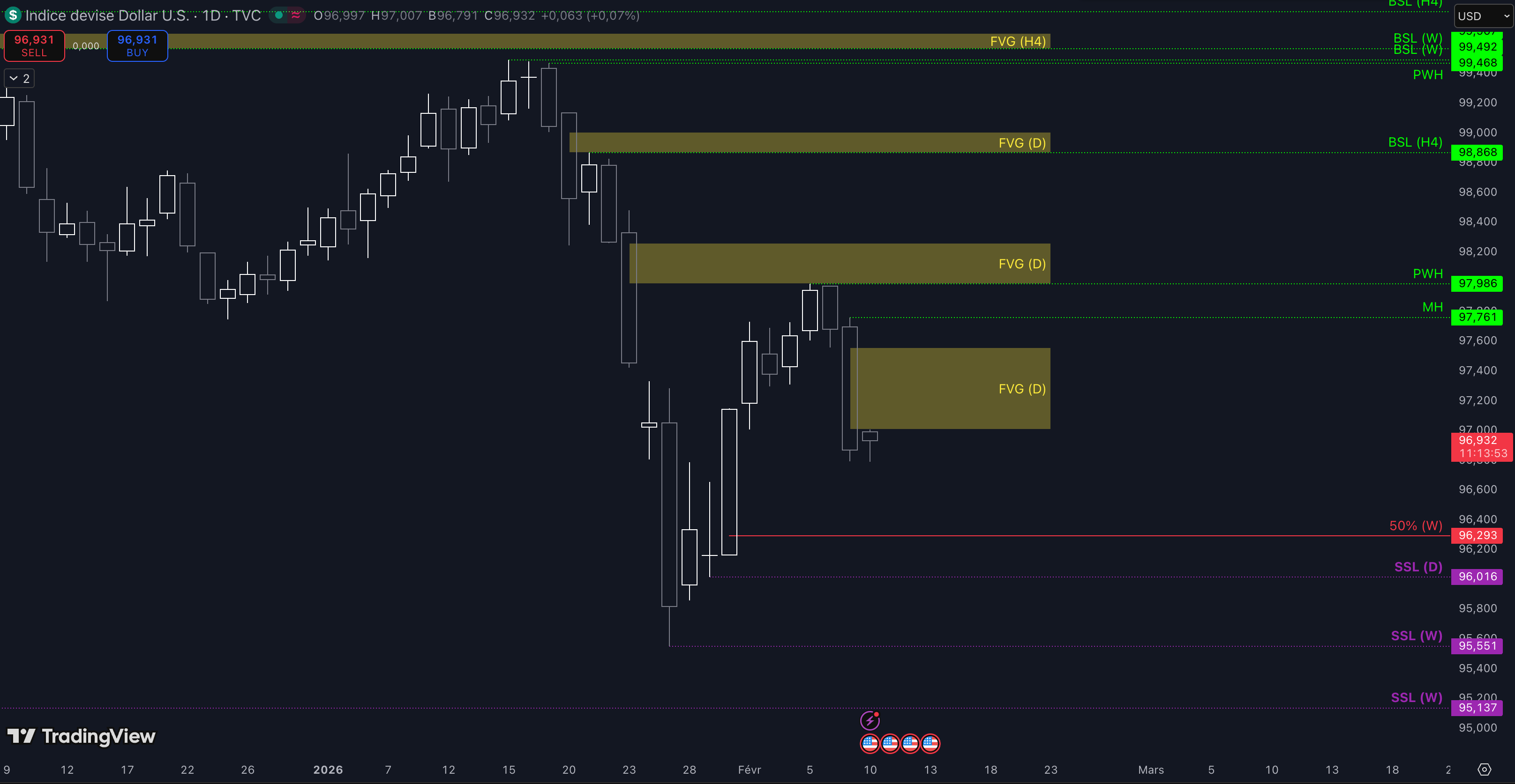 Tant que le niveau Ă 98,26 $ ne sera pas cassĂ©, câest-Ă -dire quâaucune clĂŽture daily supĂ©rieure nâest validĂ©e, alors la dynamique restera baissiĂšre et les objectifs seront :