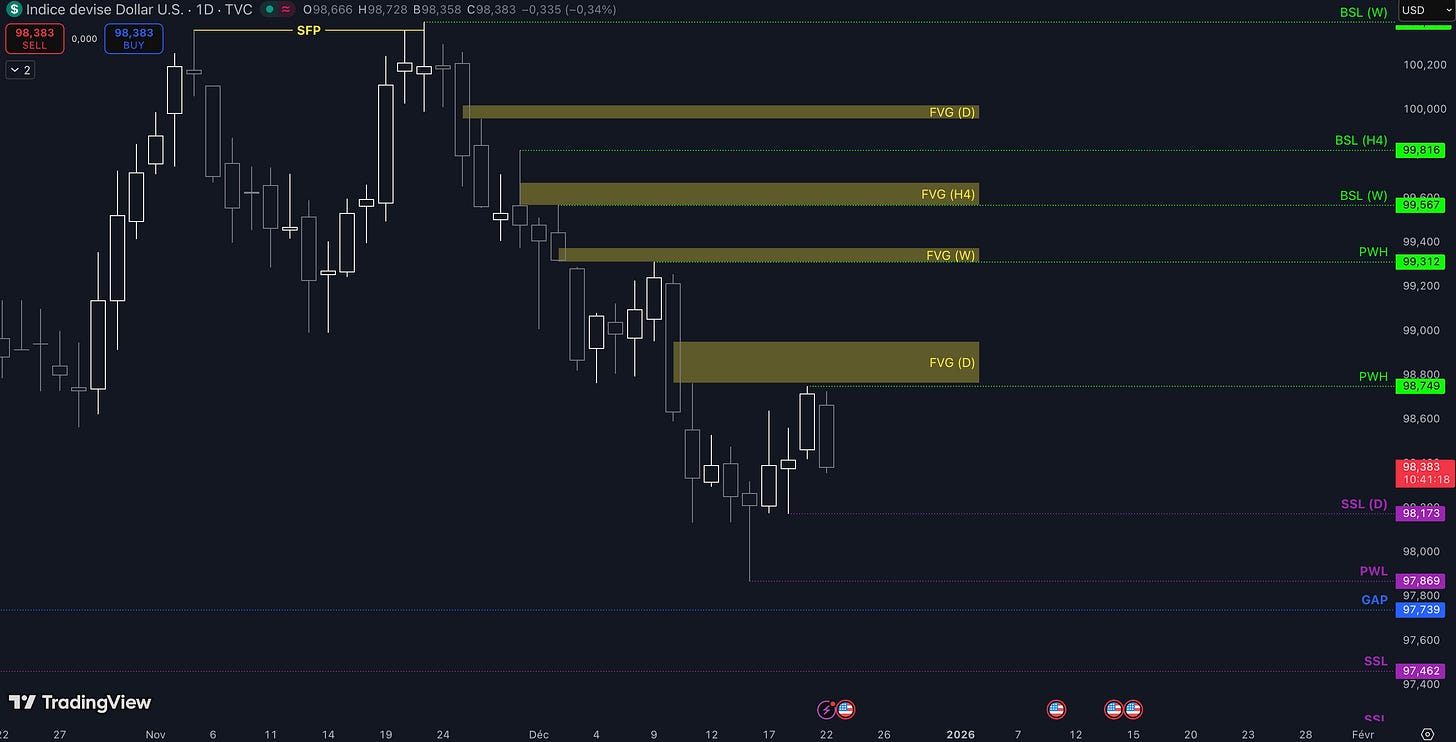 “Tant que le Fair Value Gap (FVG) entre 98,48 $ et 98,95 $ n’est pas cassé, c’est-à-dire qu’aucune clôture daily supérieure n’est validée, alors la dynamique restera baissière à court terme et les objectifs seront : le niveau à 98,13 $ (target N°1), puis, si aucun bottom ne se forme dans la zone précédente, alors le prochain objectif sera la zone de liquidités de 98,03 $ à 97,95 $ (target N°2), enfin, si toujours aucun bottom ne se forme dans la zone précédente, alors le prochain objectif sera le niveau à 97,73 $ (target N°3)”.