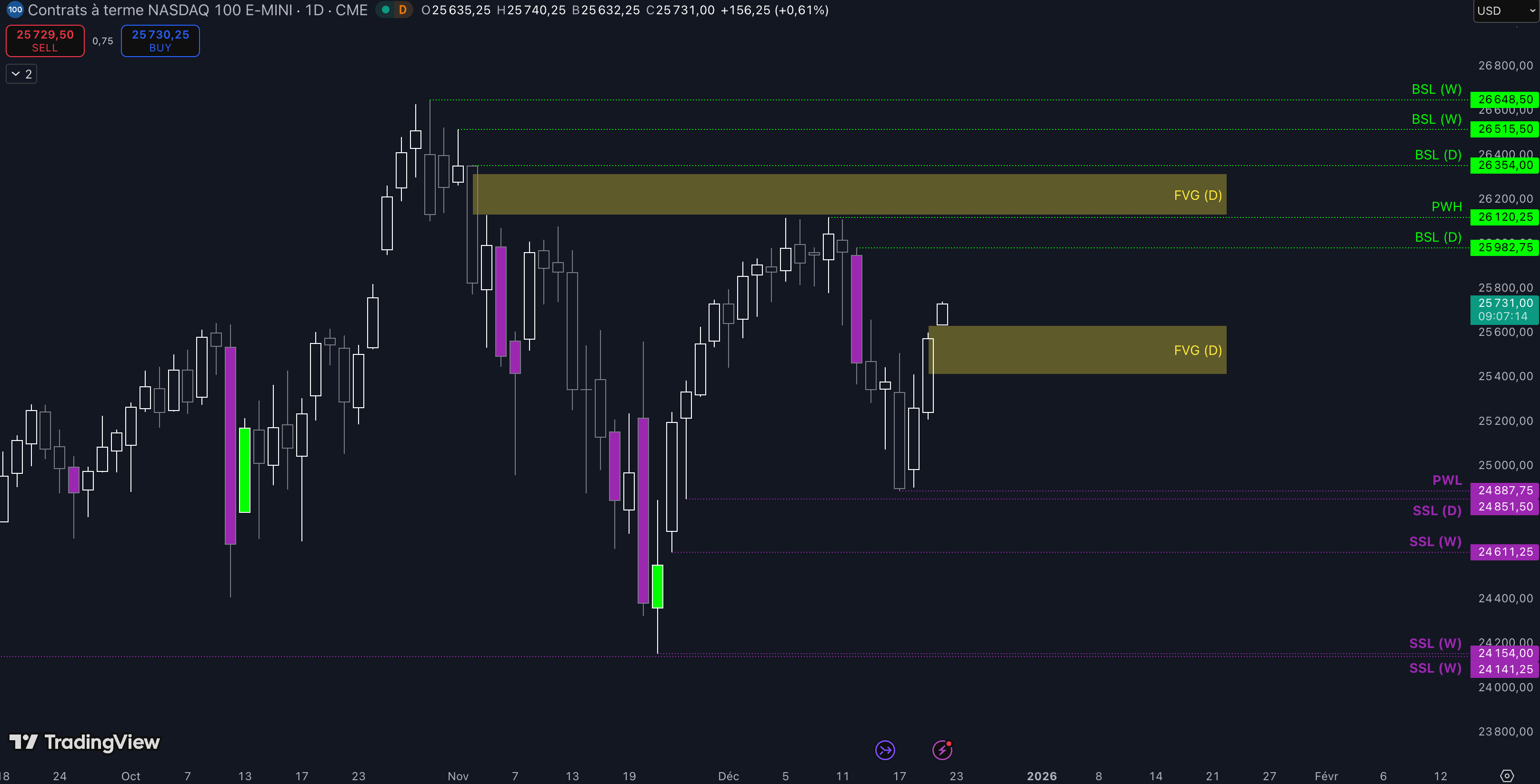 Tant que le Fair Value Gap (FVG) entre 25.412 $ et 25.632 $ est maintenu, c’est-à-dire qu’aucune clôture daily inférieure n’est validée, alors la dynamique restera haussière et les objectifs seront :