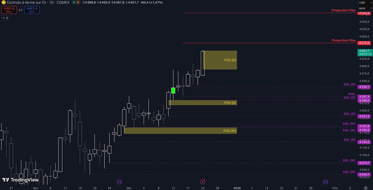 “Tant que le Fair Value Gap (FVG) entre 4.299 $ et 4.322 $ est maintenu, c’est-à-dire qu’aucune clôture daily inférieure n’est validée, alors la dynamique restera haussière et les objectifs seront : le niveau à 4.387 $ (target N°1), puis, si aucun top ne se forme dans la zone précédente, alors le prochain objectif sera le niveau à 4.435 $ (target N°2)”.