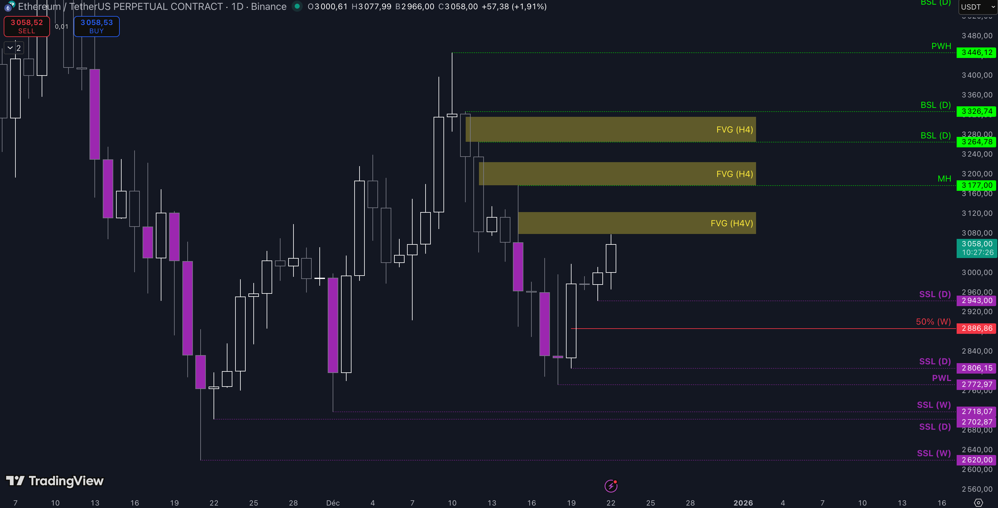 Tant que le Fair Value Gap (FVG) entre 3.079 $ et 3.124 $ n’est pas cassé, c’est-à-dire qu’aucune clôture daily supérieure n’est validée, alors la dynamique restera baissière et les objectifs seront :