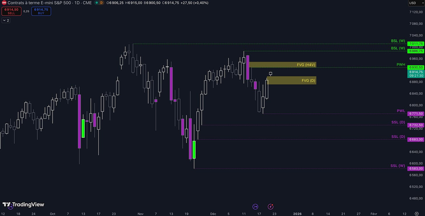 Tant que le Fair Value Gap (FVG) entre 6.872 $ et 6.900 $ est maintenu, c’est-à-dire qu’aucune clôture daily inférieure n’est validée, alors la dynamique restera haussière et les objectifs seront :