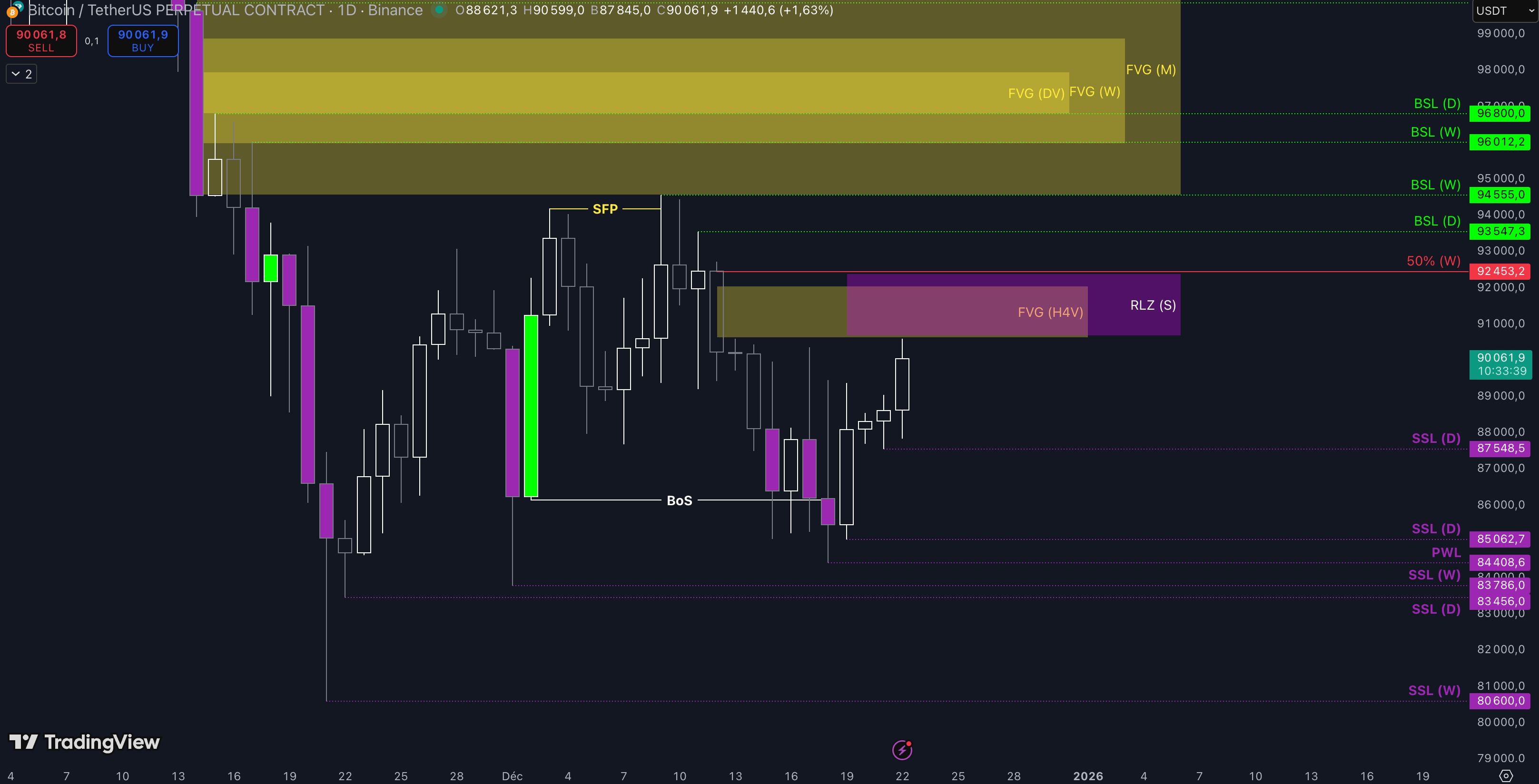 Tant que le Fair Value Gap (FVG) entre 90.599 $ et 92.039 $ n’est pas cassé, c’est-à-dire qu’aucune clôture daily supérieure n’est validée, alors la dynamique restera baissière à court terme et les objectifs seront :