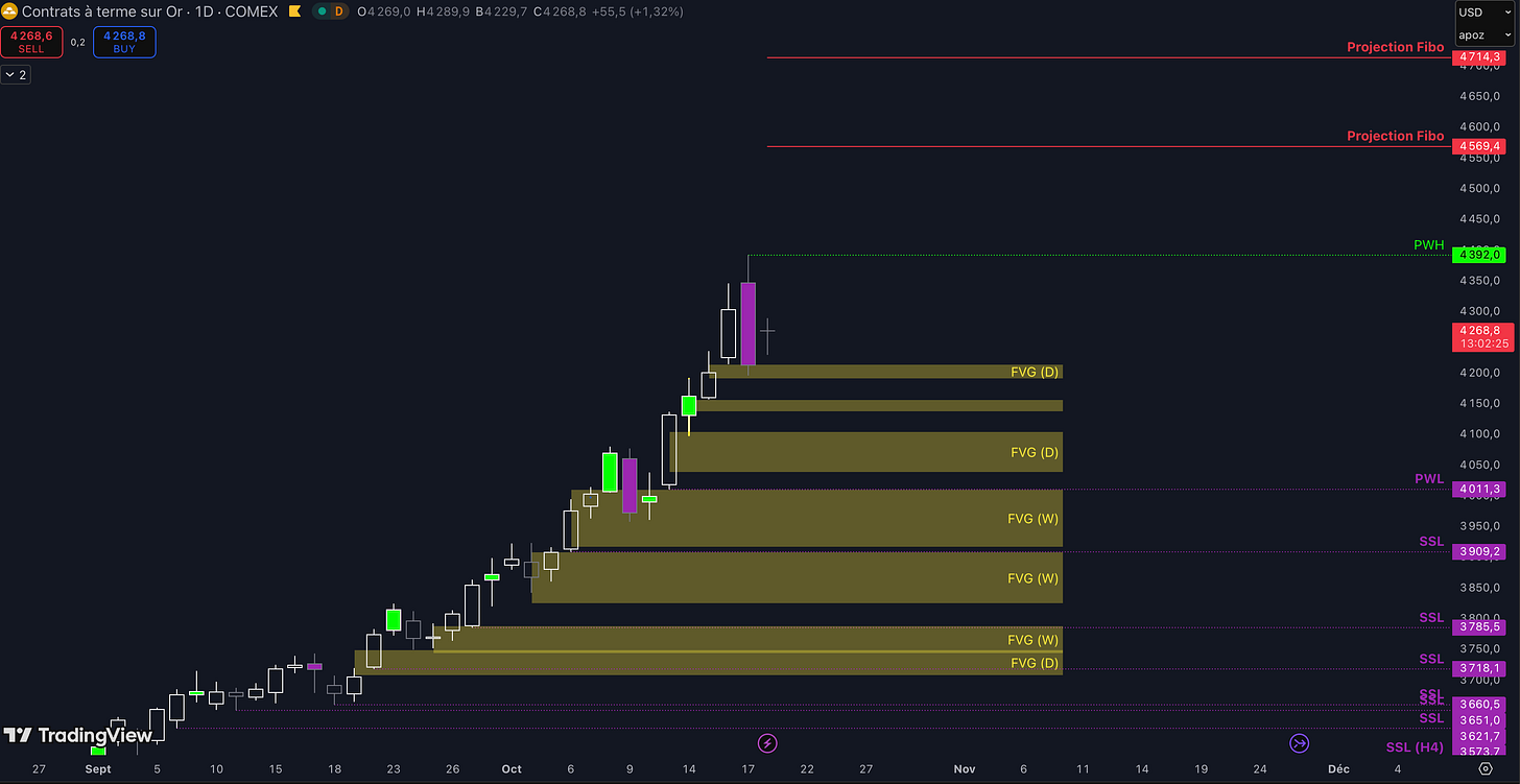 Tant que le Fair Value Gap (FVG) entre 4.190 $ et 4.214 $ est maintenu, c’est-à-dire qu’aucune clôture daily inférieure n’est validée, alors la dynamique restera haussière à court terme et les objectifs seront :