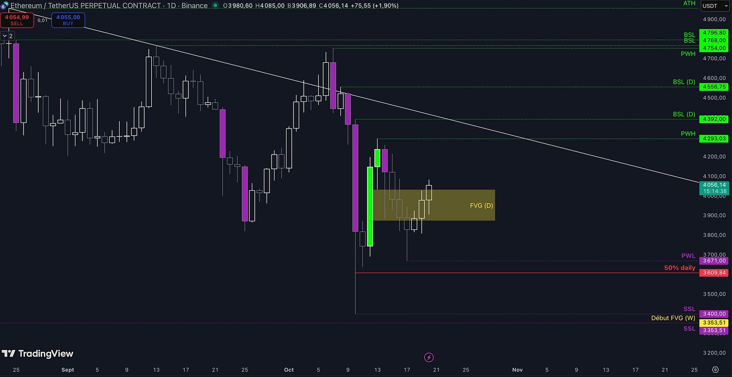 Tant que le Fair Value Gap (FVG) entre 3.874 $ et 4.113 $ est maintenu (il a été réintégré donc il est toujours valide), c’est-à-dire qu’aucune clôture daily inférieure n’est validée, alors le rebond actuel se prolongera à court terme et les objectifs seront :