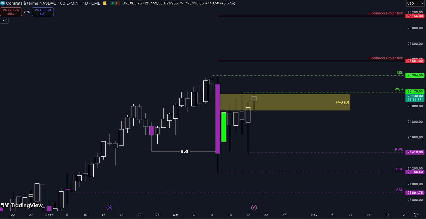 Tant que le Fair Value Gap (FVG) entre 24.945 $ et 25.160 $ n’est pas cassé, c’est-à-dire qu’aucune clôture daily supérieure n’est validée, alors la dynamique restera baissière à court terme et les objectifs seront :