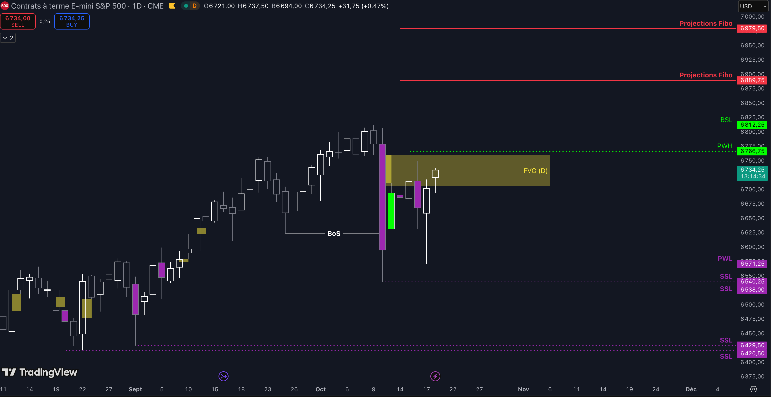 “Tant que le Fair Value Gap (FVG) entre 6.706 $ et 6.760 $ n’est pas cassé, c’est-à-dire qu’aucune clôture daily supérieure n’est validée, alors la dynamique restera baissière à court terme et les objectifs seront : la zone de liquidités entre 6.538 $ et 6.540 $ (target N°1), puis, si aucun bottom ne se forme dans la zone précédente, alors le prochain objectif sera la zone de liquidités entre 6.420 $ et 6.429 $ (target N°2)”.