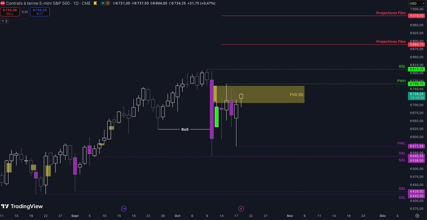 Tant que le Fair Value Gap (FVG) entre 6.706 $ et 6.760 $ n’est pas cassé, c’est-à-dire qu’aucune clôture daily supérieure n’est validée, alors la dynamique restera baissière à court terme et les objectifs seront :