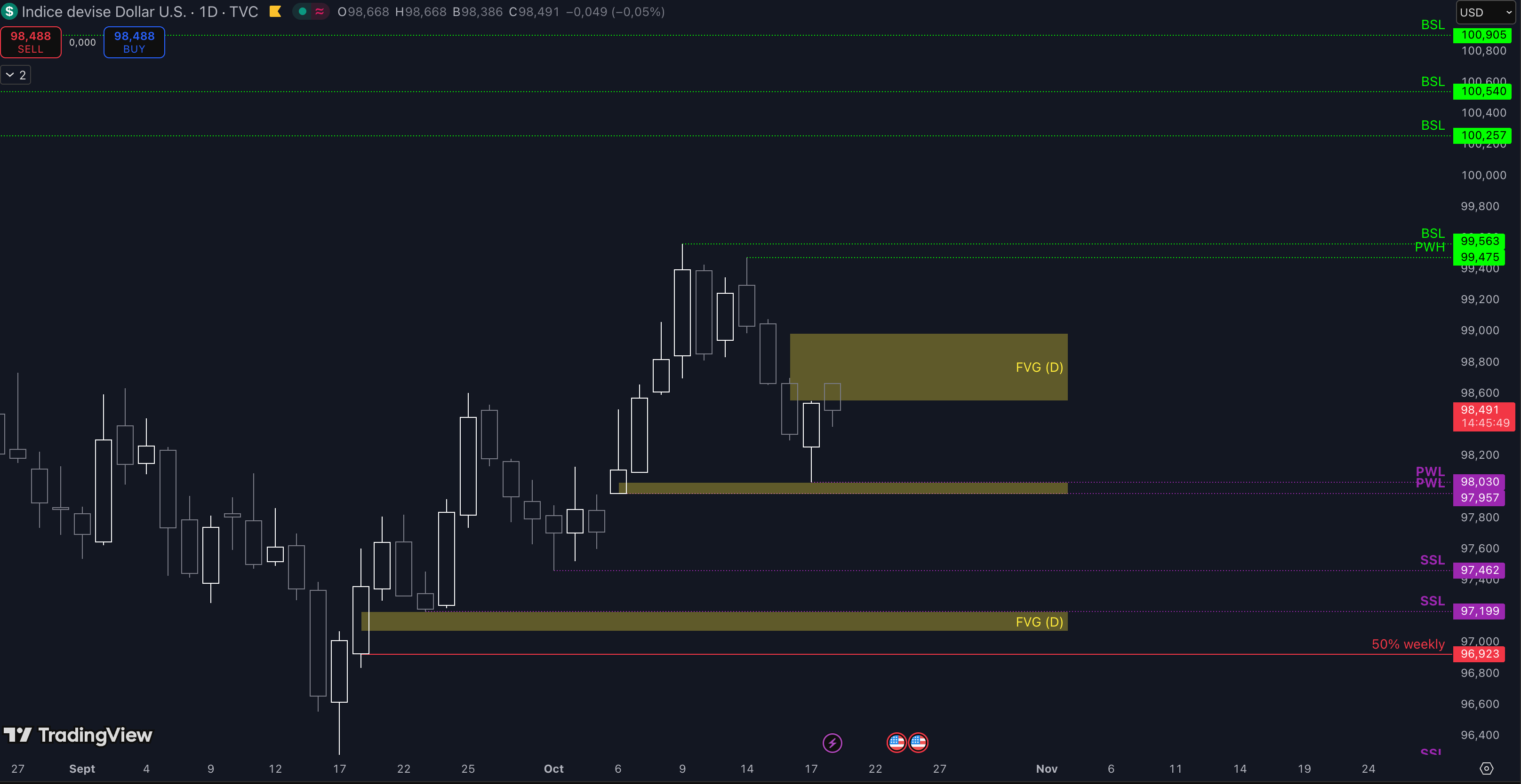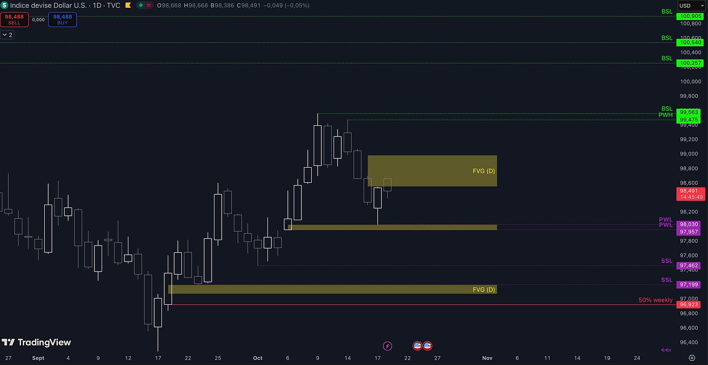 Tant que le Fair Value Gap (FVG) entre 98,56 $ et 98,98 $ n’est pas cassé, c’est-à-dire qu’aucune clôture daily supérieure n’est validée, alors la dynamique sera baissière à court terme et les objectifs seront :