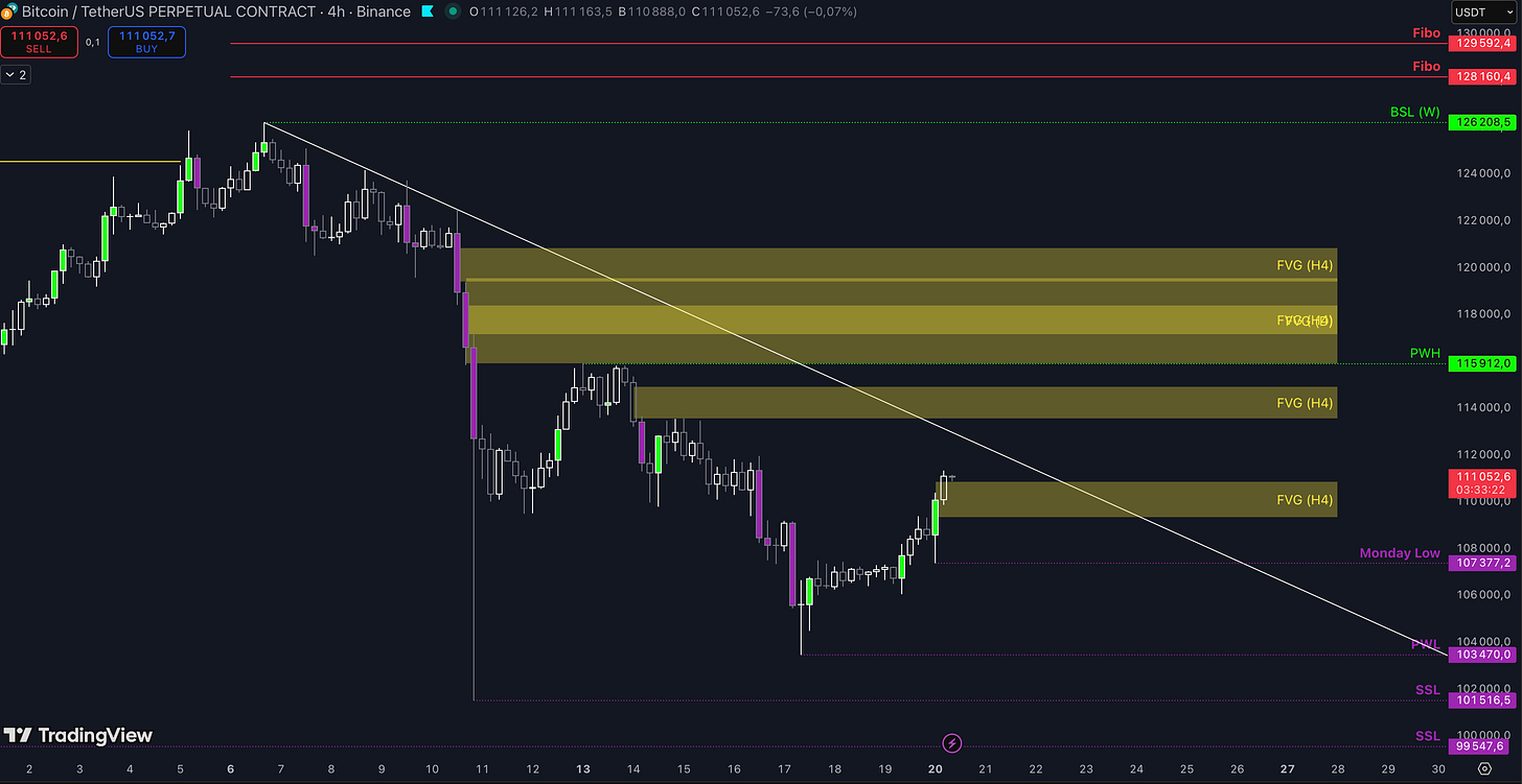 Tant que le Fair Value Gap (FVG) entre 109.340 $ et 110.888 $ est maintenu, c’est-à-dire qu’aucune clôture daily inférieure n’est validée, alors le rebond actuel se prolongera à court terme et les objectifs seront :