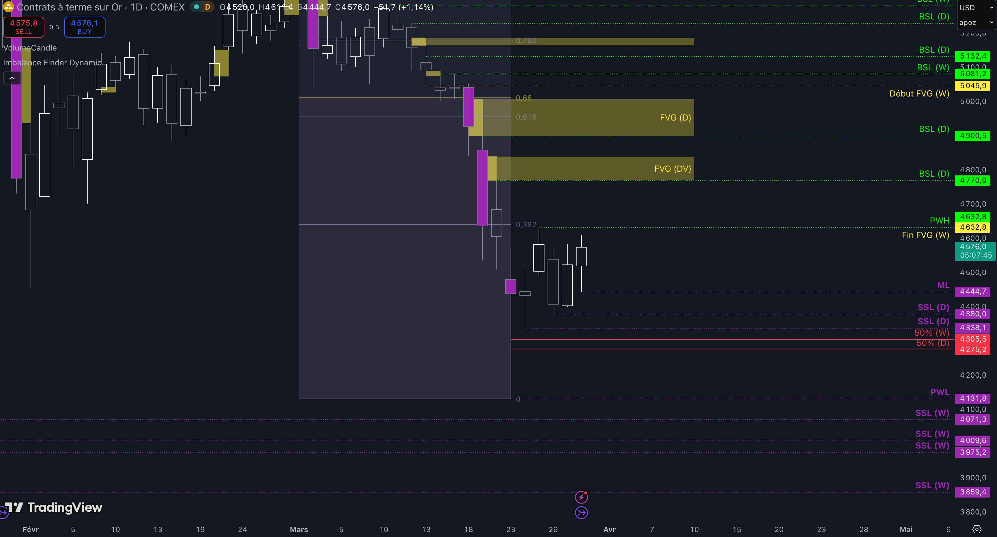 Puis, si aucun bottom ne se forme dans la zone précédente, alors le prochain objectif sera la poche de liquidités entre 4.380 $ et 4.275 $ (target N°2) ;
