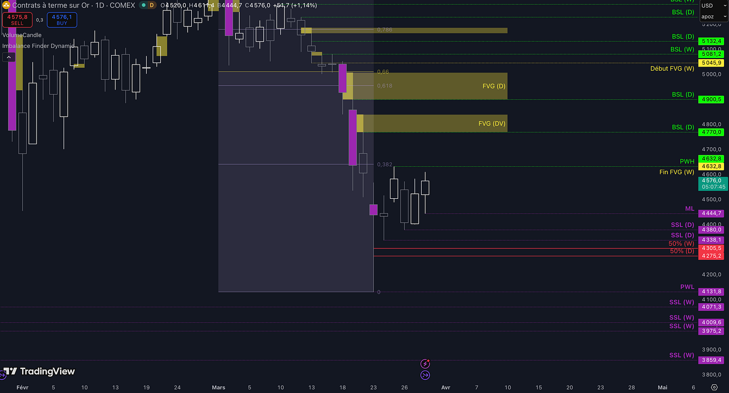 “Tant que le niveau à 4.808 $ ne sera pas cassé, c’est-à-dire qu’aucune clôture daily supérieure n’est validée, alors la dynamique restera baissière à court terme et les objectifs seront : le niveau à 4.275 $ (target N°1), puis, si aucun bottom ne se forme dans la zone précédente, alors le prochain objectif sera la poche de liquidités entre 4.100 $ et 4.071 $ (target N°2)”.