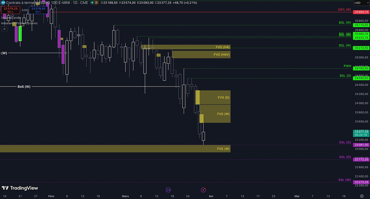 “Tant que les 25.148 $ ne sont pas cassés, c’est-à-dire qu’aucune clôture daily supérieure n’est validée, alors la dynamique restera baissière et les objectifs seront : la poche de liquidités entre 23.772 $ et 23.728 $ (target N°1), puis, si aucun bottom ne se forme dans la zone précédente, alors le prochain objectif sera la poche de liquidités entre 23.525 $ et 23.481 $ (target N°2), enfin, si toujours aucun bottom ne se forme dans la zone précédente, alors le prochain objectif sera le niveau à 23.285 $ (target N°3)”.