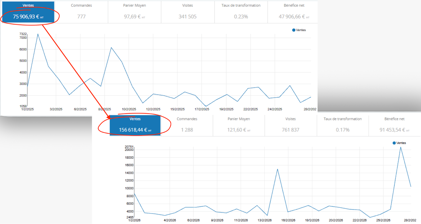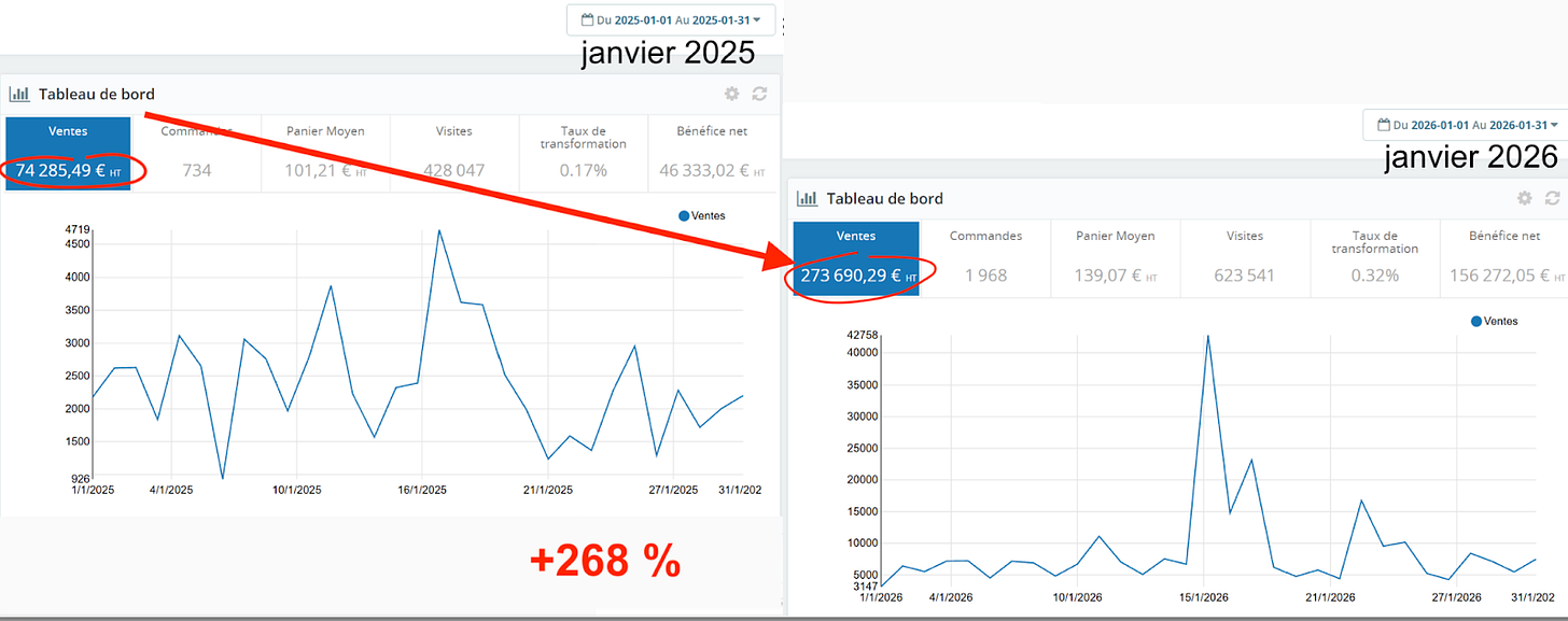 Même si elle n’explose pas à la hausse, au pire l’entreprise reste rentable. Celle dont le CA mensuel a fait un bon de + 270 % faisait déjà 660.000 € de résultat en 2025. Pas de chiffre d’affaires. De bénéfice !