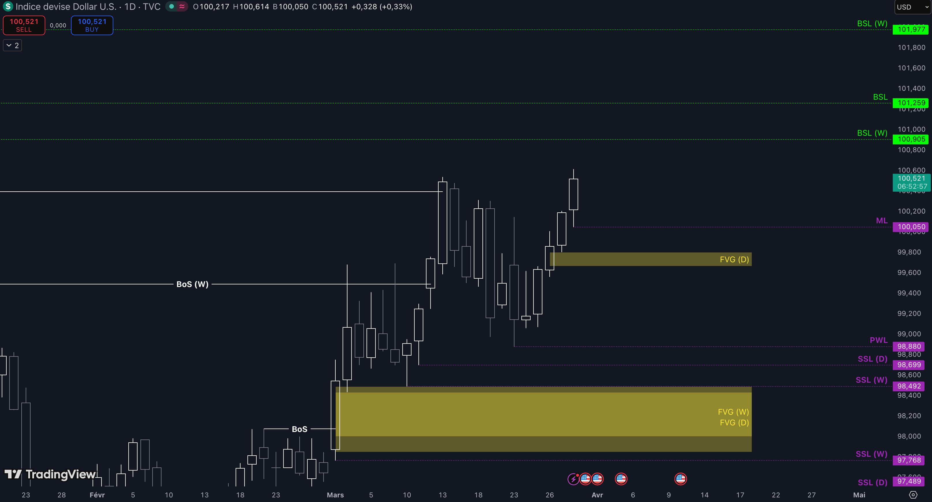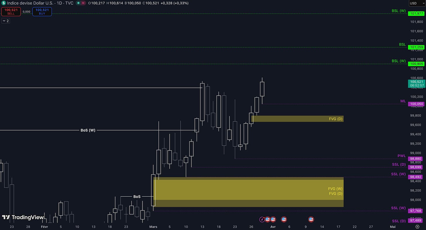 “Tant que le niveau à 98,95 $ sera maintenu, c’est-à-dire qu’aucune clôture daily inférieure n’est validée, alors la dynamique restera haussière à court terme et les objectifs seront : le niveau à 100,14 $ (target N°1), puis, si aucun top ne se forme dans la zone précédente, alors le prochain objectif sera la poche de liquidités entre 100,48 $ et 100,54 $ (target N°2)”.