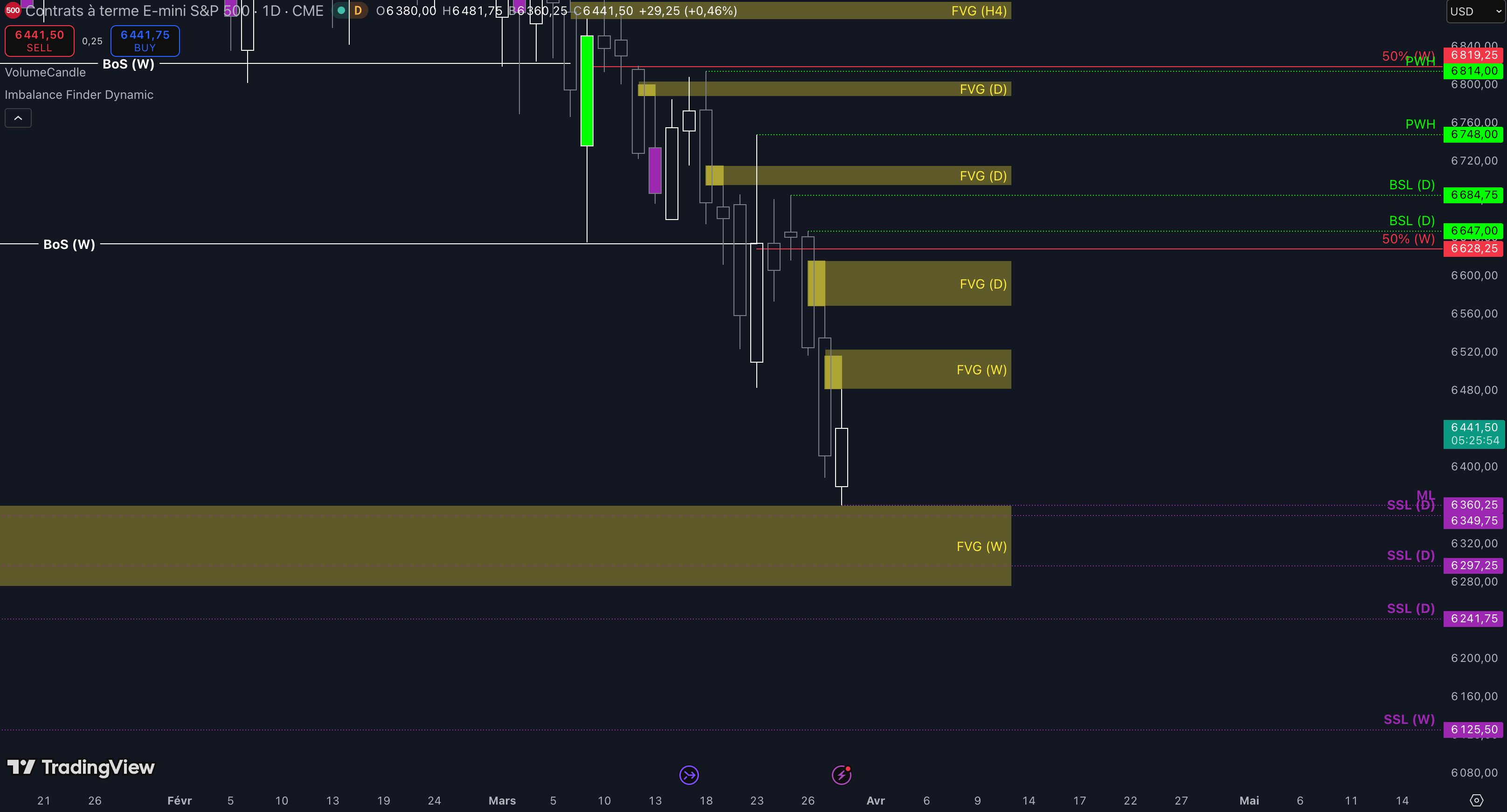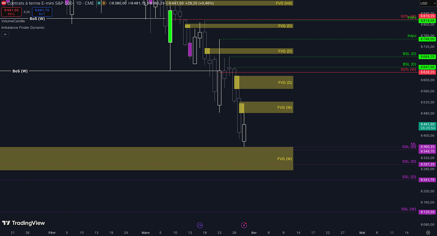 “Tant que les 6.716 $ ne sont pas cassés, c’est-à-dire qu’aucune clôture daily supérieure n’est validée, alors la dynamique restera baissière à court terme et les objectifs seront : le niveau à 6.483 $ (target N°1), puis, si aucun bottom ne se forme dans la zone précédente, alors le prochain objectif sera la poche de liquidités entre 6.417 $ et 6.389 $ (target N°2), enfin, si toujours aucun bottom ne se forme dans la zone précédente, alors le prochain objectif sera le niveau à 6.349 $ (target N°3)”.