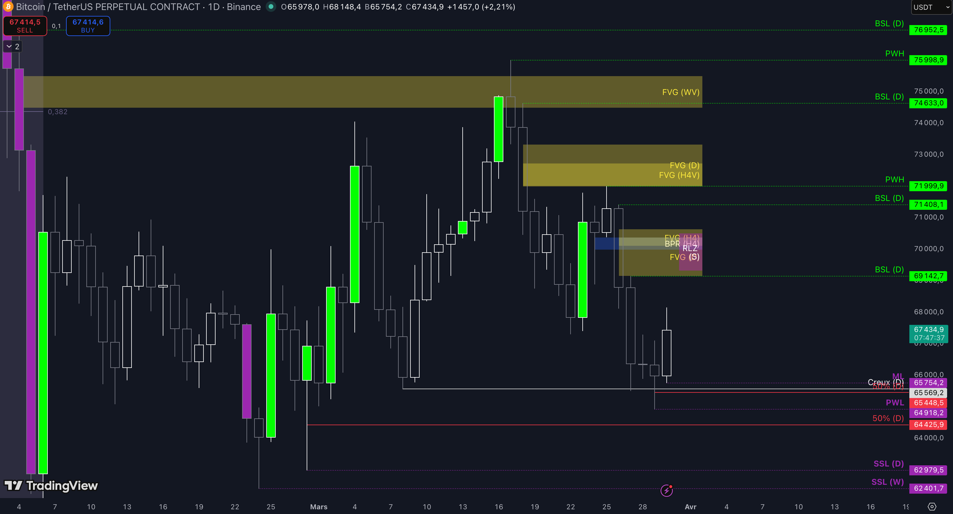 La poche de liquidités entre 65.754 $ et 65.448 $ (target N°1) ;