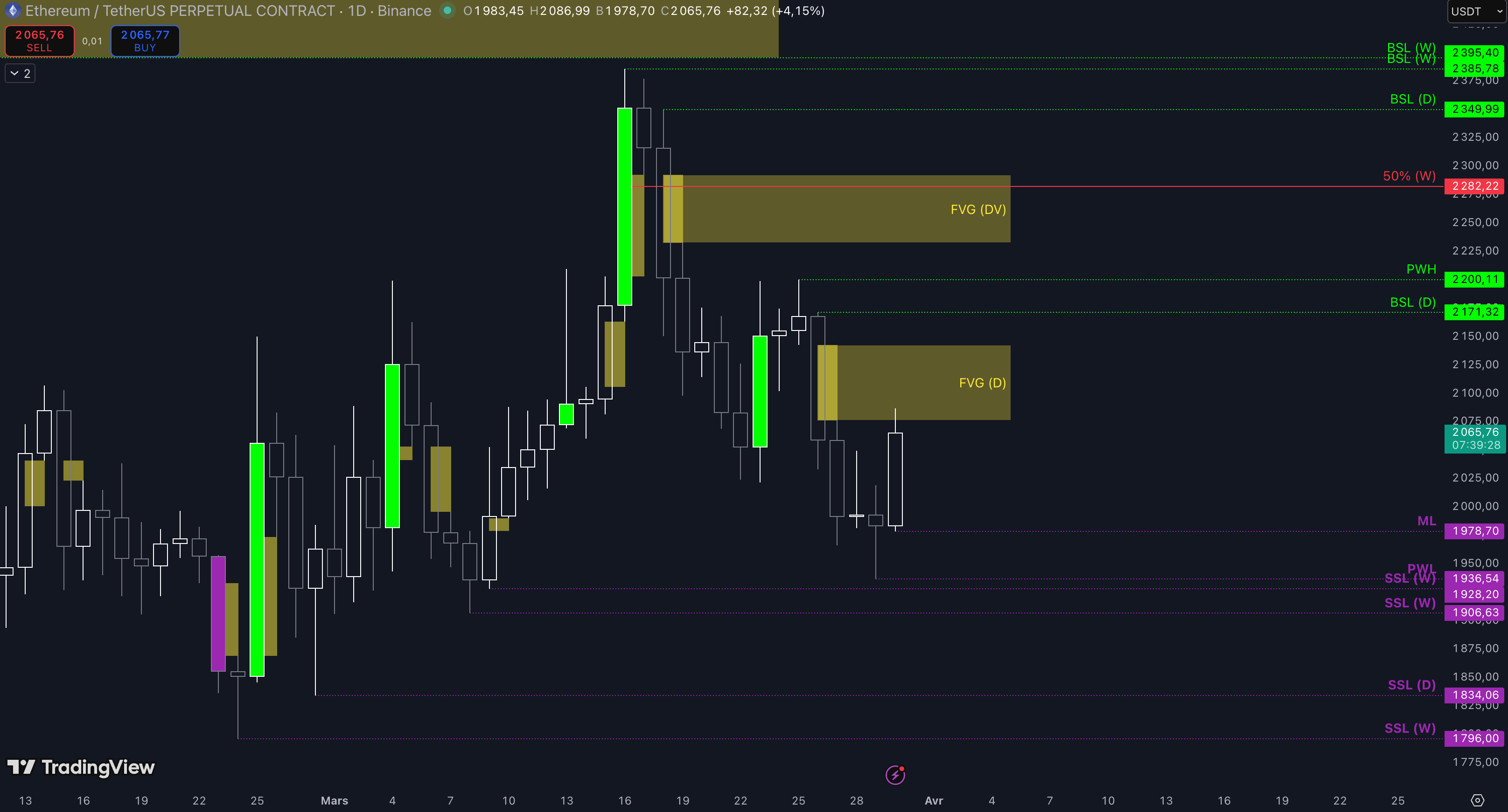 Le niveau à 2.292 $ n’a pas été cassé, donc la dynamique du prix est restée baissière et le TP N°1 du short a été atteint à 2.005 $ - 1 TP validé ✅