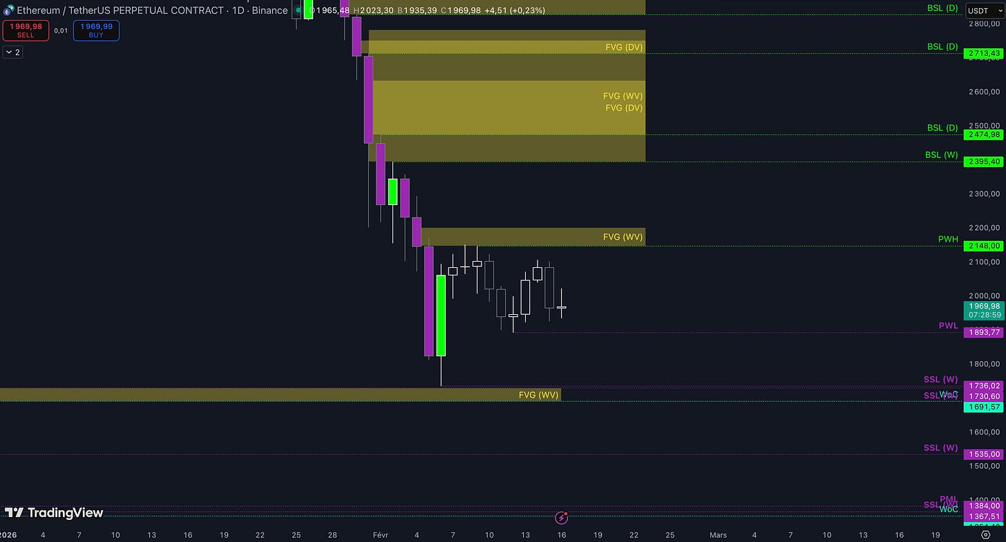 Tant que le niveau à 2.201 $ n’est pas cassé, c’est-à-dire qu’aucune clôture daily supérieure n’est validée, alors la dynamique restera baissière et les objectifs seront :
