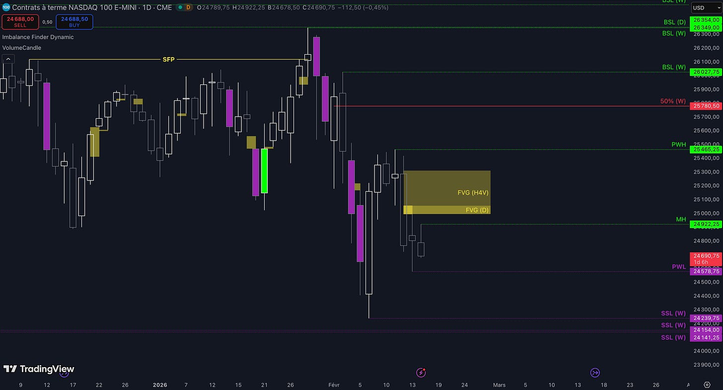 Le niveau à 25.189 $ a d’abord été maintenu, menant à la validation du TP N°1 du long à 25.428 $. Puis, le flux s’est inversé en cassant le niveau à 25.189 $, donc la dynamique est devenue baissière et les TP N°1 et N°2 du short ont été atteints à 24.955 $ et 24.700 $ - 3 TP validés ✅