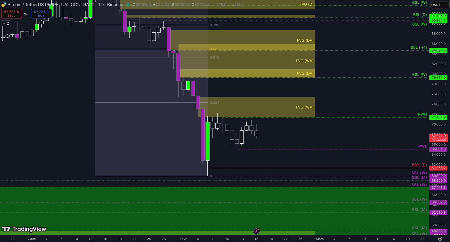 “Tant que le niveau à 75.465 $ n’est pas cassé, c’est-à-dire qu’aucune clôture daily supérieure n’est validée, alors la dynamique restera baissière et les objectifs seront : le niveau à 67.250 $ (target N°1), puis, si aucun bottom ne se forme dans la zone précédente, alors le prochain objectif sera le niveau à 65.258 $ (target N°2)”.