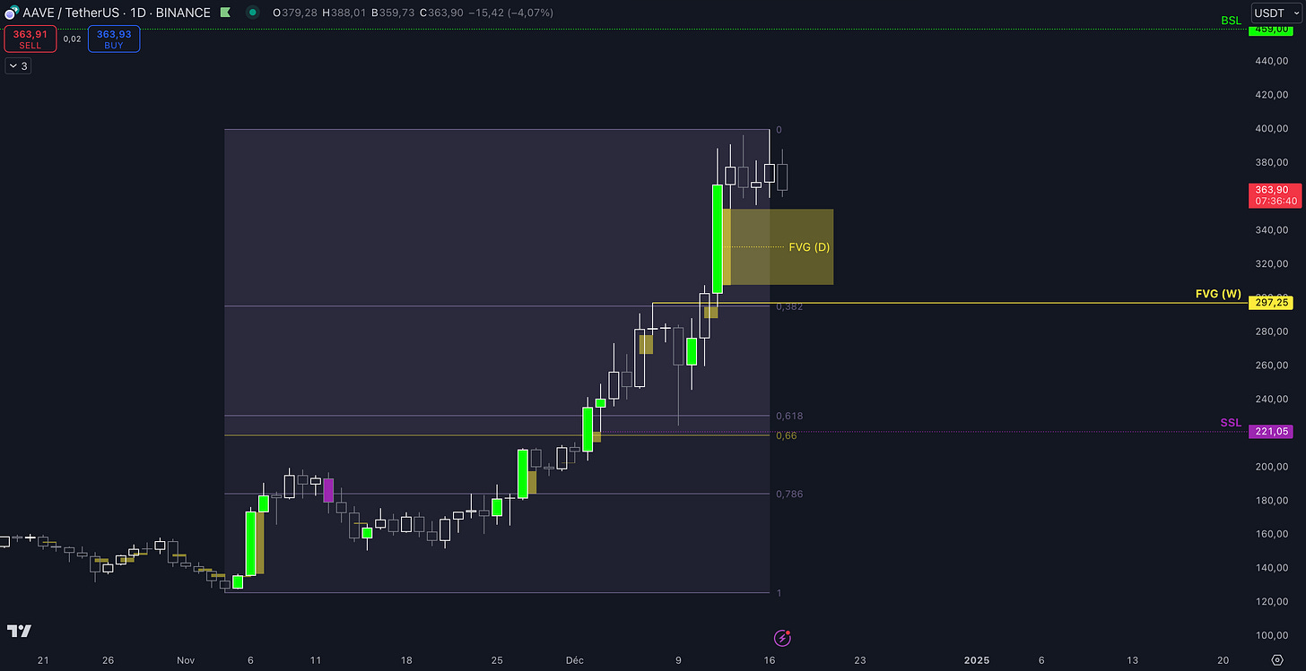 Tant que l’imbalance daily entre 308 $ et 352 $ est maintenue, qui est de confluence avec une FVG weekly qui s’étend jusqu’à 297 $ au niveau du premier arrêt de Fibonacci, alors le flux restera haussier et le prochain objectif sera la BSL à 459 $.