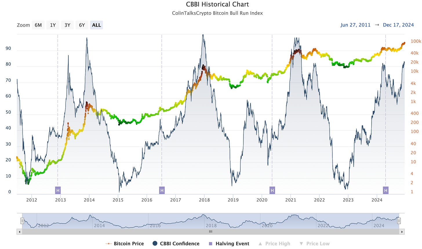 Le CBBI pointe actuellement à 83/100, soit une augmentation de 2 points par rapport à la semaine passée, donc les métriques on-chain et sentimentales montrent que le BTC ne semble pas proche d’un top définitif par rapport aux chiffres des fins de cycles précédents qui oscillaient entre 98 et 100.