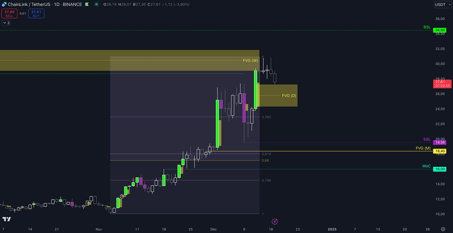 LINK retrace légèrement mais logiquement après avoir atteint une FVG weekly baissière qui demeure un point d’intérêt important.