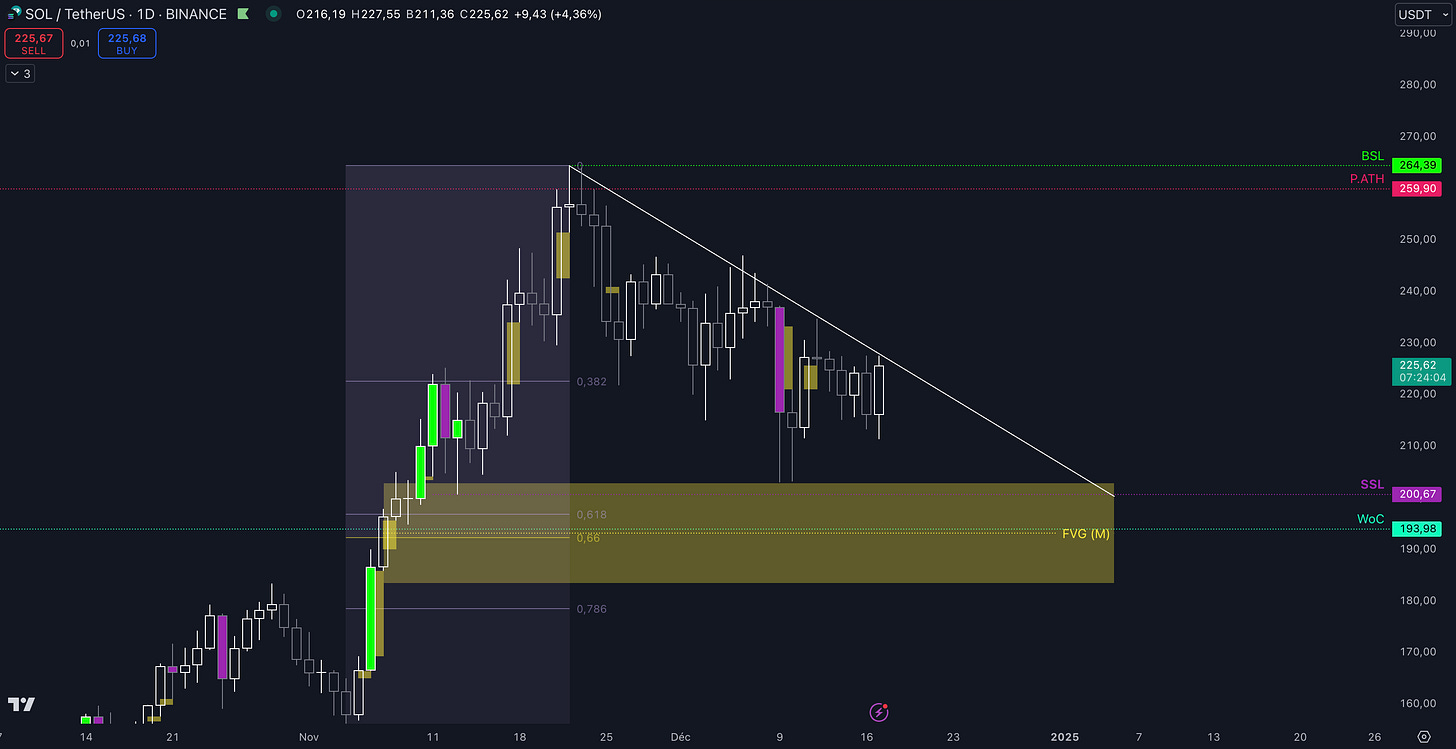 En revanche, si le prix ne parvient pas à casser la trendline, alors la correction se prolongera dans la RLZ long où il y a d’importantes confluences d’achats : SSL à 200 $ qui couvre une FVG mensuelle encore vierge dont l’équilibrium correspond à un WoC weekly (= zone où placer des buy limit).