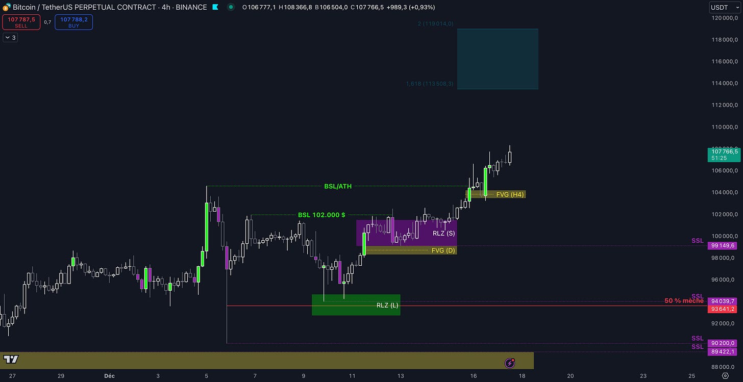 “La BSL à 98.320 $ qui couvrait une FVG H1 a été cassée donc le flux du BTC à court terme est haussier. Ainsi, tant que la FVG daily entre 98.500 $ et 100.100 $ est maintenue, alors l’objectif du flux sera la BSL à 102.000 $. S’il n’y a pas de retournement sur la prise des 102.000 $, alors le prochain objectif sera l’ATH à 104.630 $ avant une continuation haussière vers les 107.000 $”.