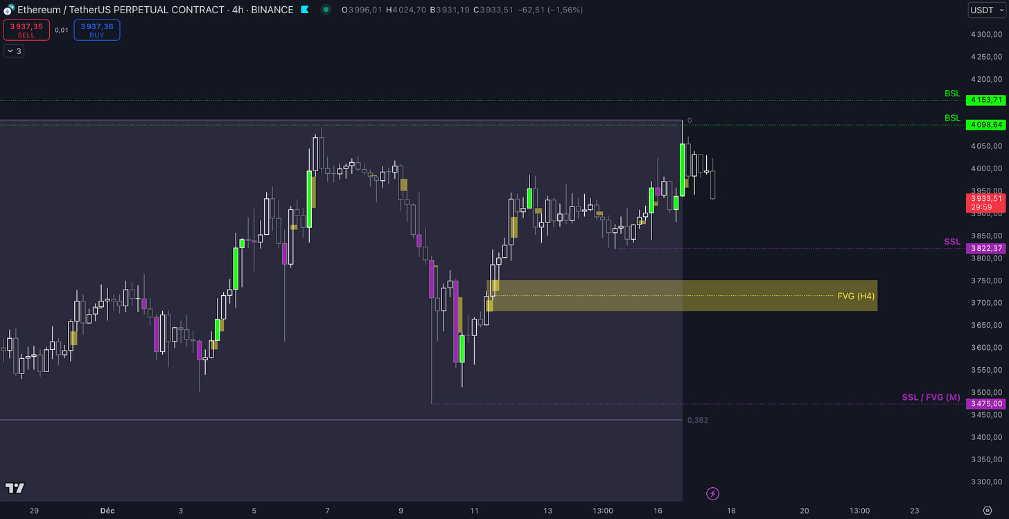 En revanche, tant que les 4.100 $ ne sont pas repris et maintenus, les objectifs sont la SSL à 3.822 $ et, si aucun bottom ne s’y forme, la FVG H4 entre 3.680 $ et 3.750 $.
