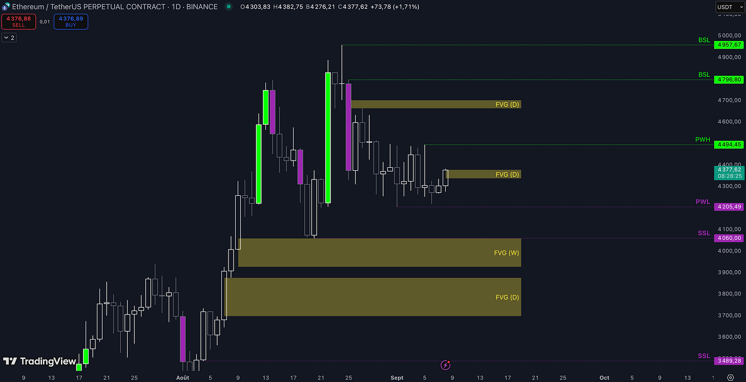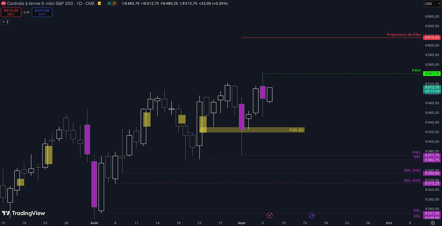 Tant que le Fair Value Gap (FVG) entre 4.338 $ et 4.377 $ est maintenu, c’est-à-dire qu’aucune clôture daily inférieure n’est validée, alors la dynamique restera haussière et les objectifs seront :