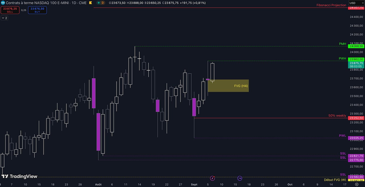 Tant que le Fair Value Gap (FVG) entre 23.689 $ et 23.551 $ est maintenu, c’est-à-dire qu’aucune clôture daily inférieure n’est validée, alors la dynamique restera haussière et les objectifs seront :