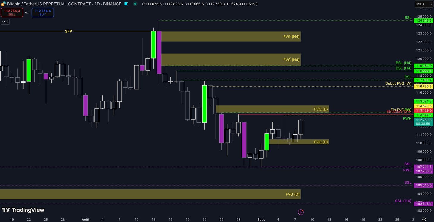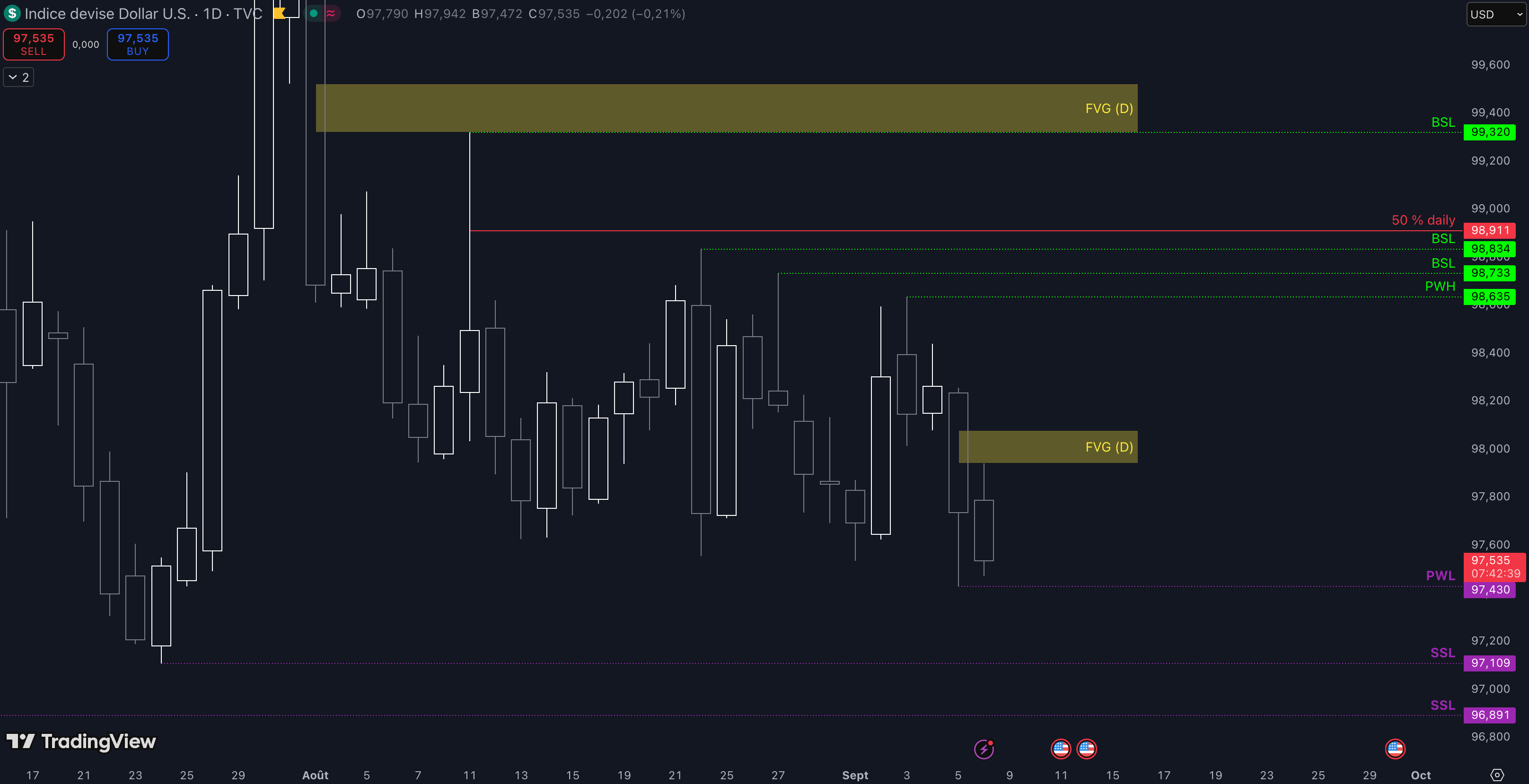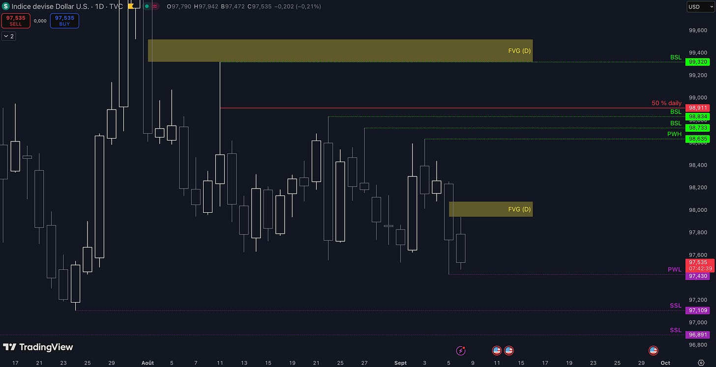 Tant que le Fair Value Gap (FVG) entre 97,94 $ et 98,08 $ ne sera pas cassé, c’est-à-dire qu’aucune clôture daily supérieure n’est validée, alors la dynamique restera baissière et les objectifs seront :