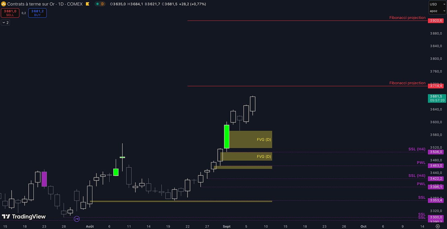 Tant que le Fair Value Gap (FVG) entre 3.519 $ et 3.573 $ est maintenu, c’est-à-dire qu’aucune clôture daily inférieure n’est validée, alors la dynamique restera haussière à court terme et les objectifs seront :
