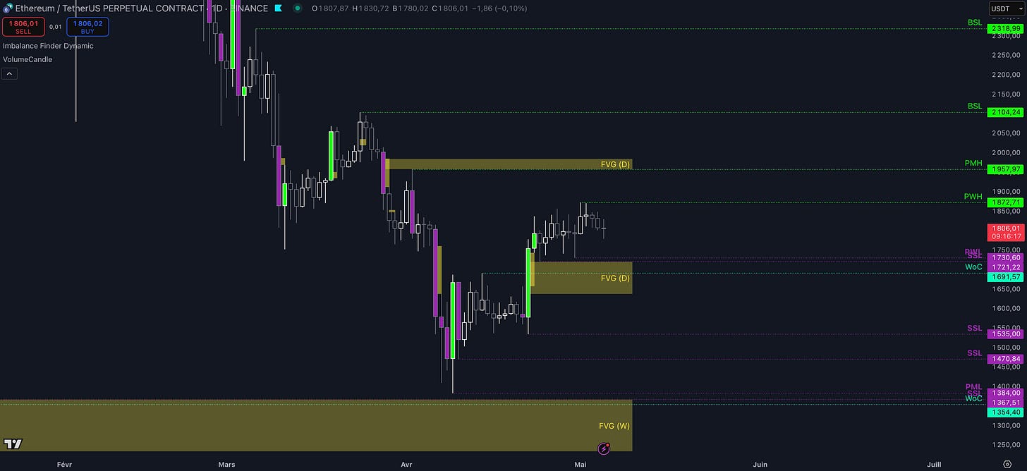 Tant que l’ETH ne perd pas la poche de liquidités entre 1.730 $ et 1.721 $ (qui couvre une imbalance étendue jusqu’à 1.638 $) par une clôture daily inférieure sans réintégration, alors la dynamique haussière restera intacte et les objectifs seront :