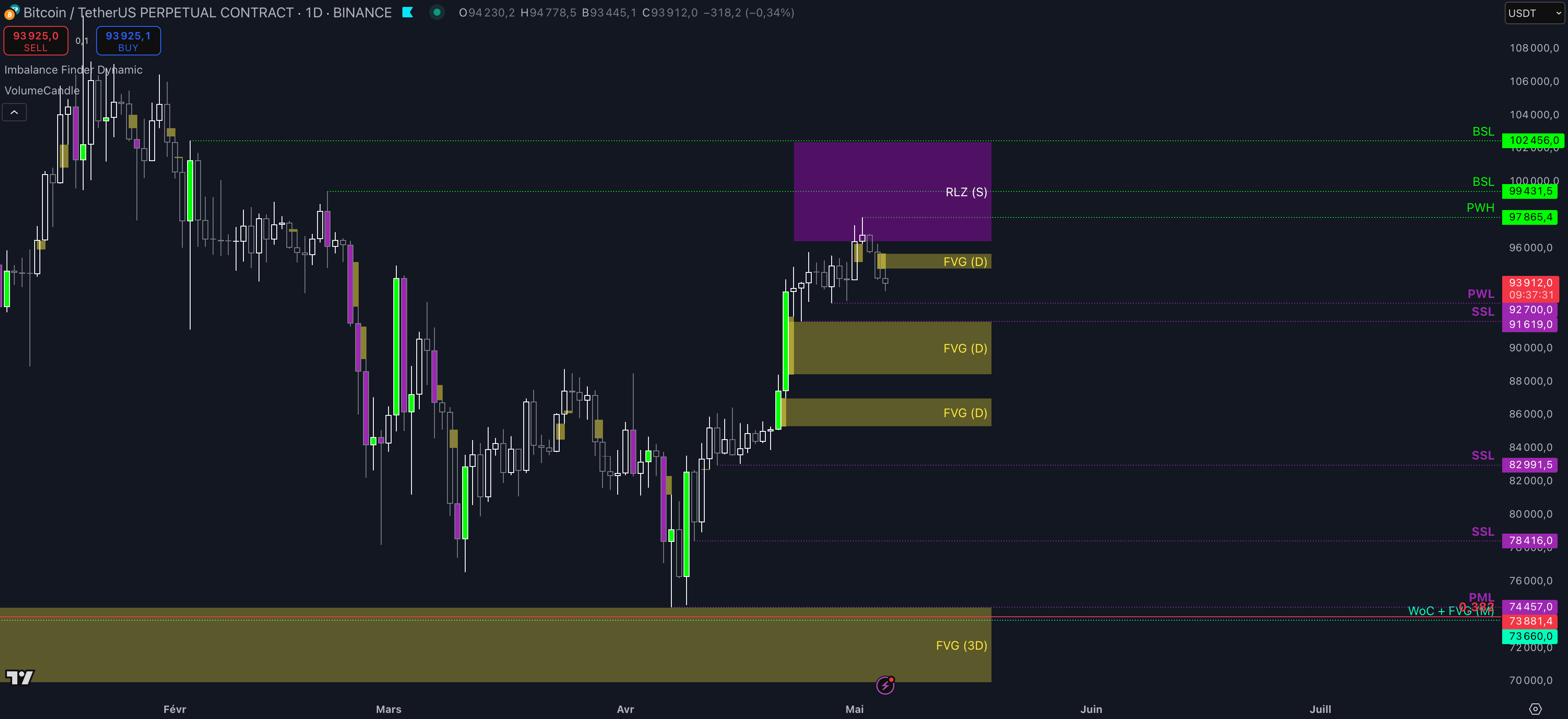 Ainsi, tant que le prix ne clôturera pas en daily au-dessus du Fair Value Gap (FVG) compris entre 94.792 $ et 95.677 $ sans réintégration, alors la dynamique restera baissière à court terme et les objectifs seront :