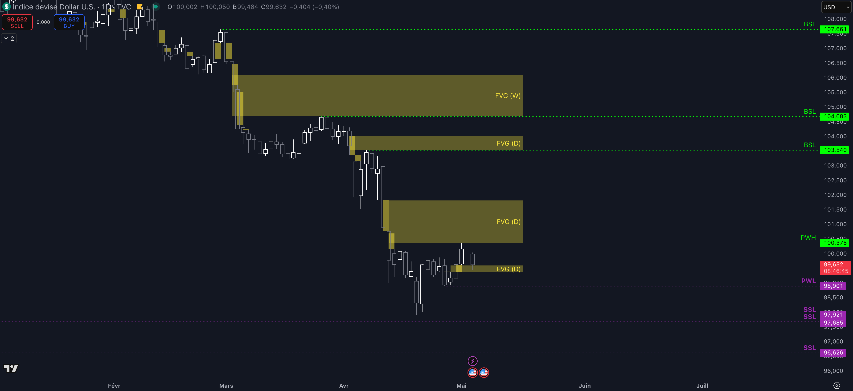 Tant que le Fair Value Gap (FVG) compris entre 99,61 $ et 99,39 $ est maintenu, c’est-à-dire qu’aucun clôture daily inférieure n’est validée, alors le rebond se poursuivra et les objectifs seront :