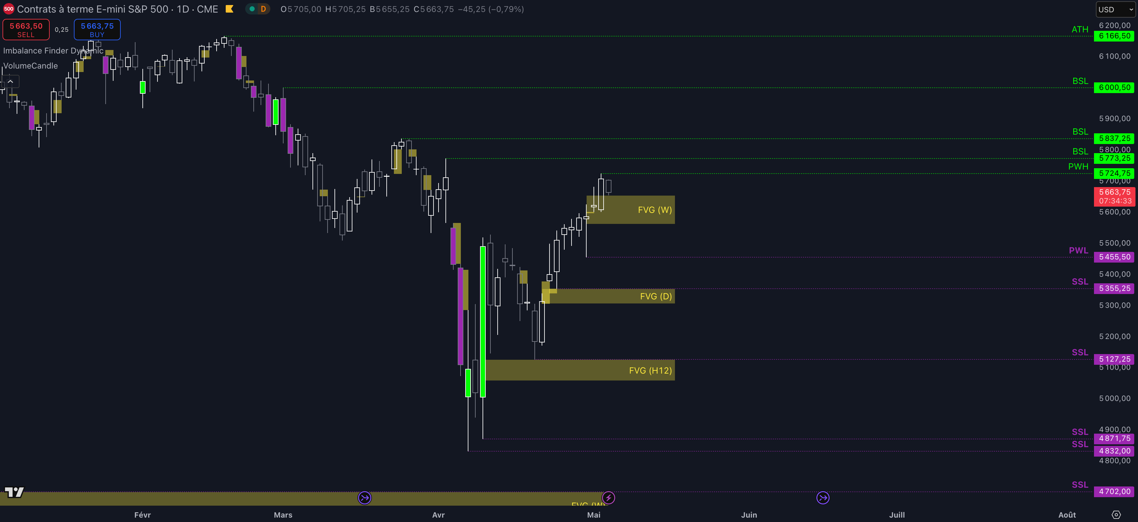 En revanche, si le prix se retourne après l’atteinte de l’une des 3 targets ci-dessus et/ou que le Fair Value Gap (FVG) est perdu par une clôture daily inférieure à 5.565 $ sans réintégration haussière du niveau ensuite, alors la dynamique deviendra baissière à court terme et les objectifs seront :