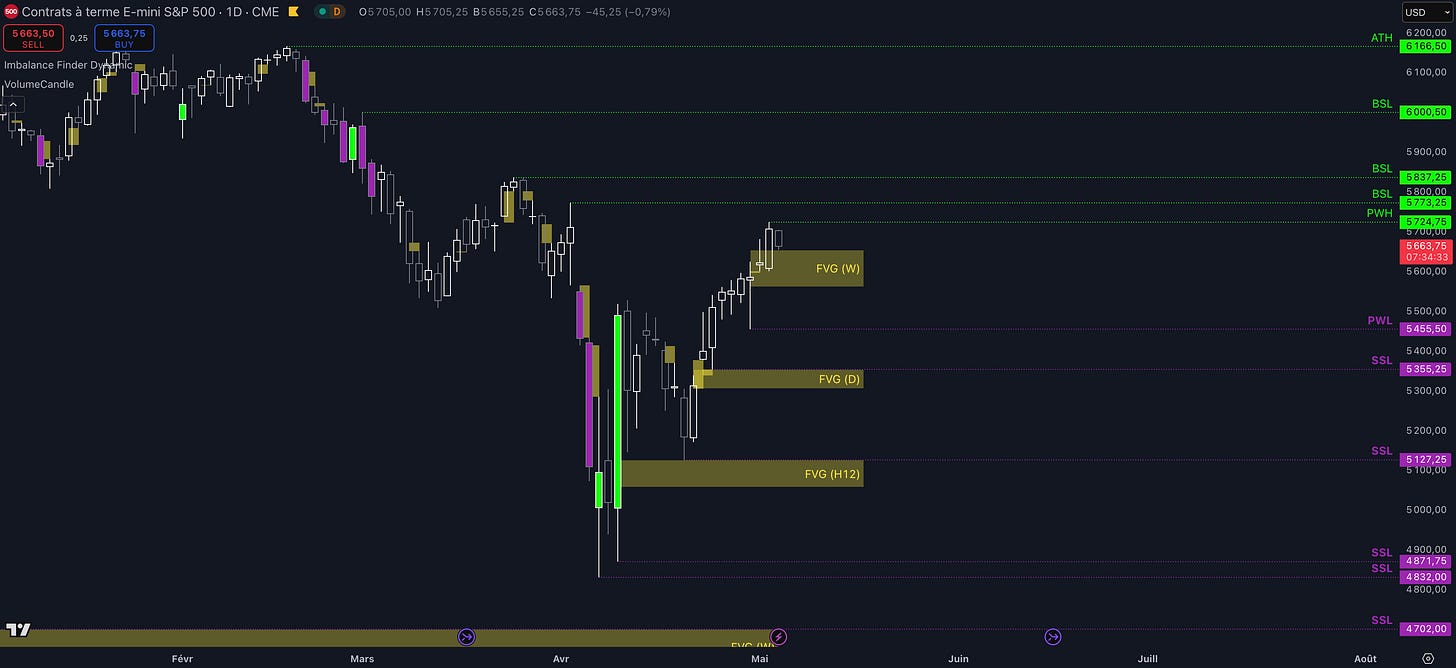 “Si […] le prix clôture au-dessus de 5.562 $ en daily sans être rejeté par la zone d’imbalance étendue jusqu’à 5.601 $, alors la dynamique deviendra à nouveau haussière et les targets seront : le niveau à 5.773 $ (target N°1), puis, si aucun top ne se forme dans la zone précédente, alors le prochain objectif sera 5.837 $ (target N°2)”.