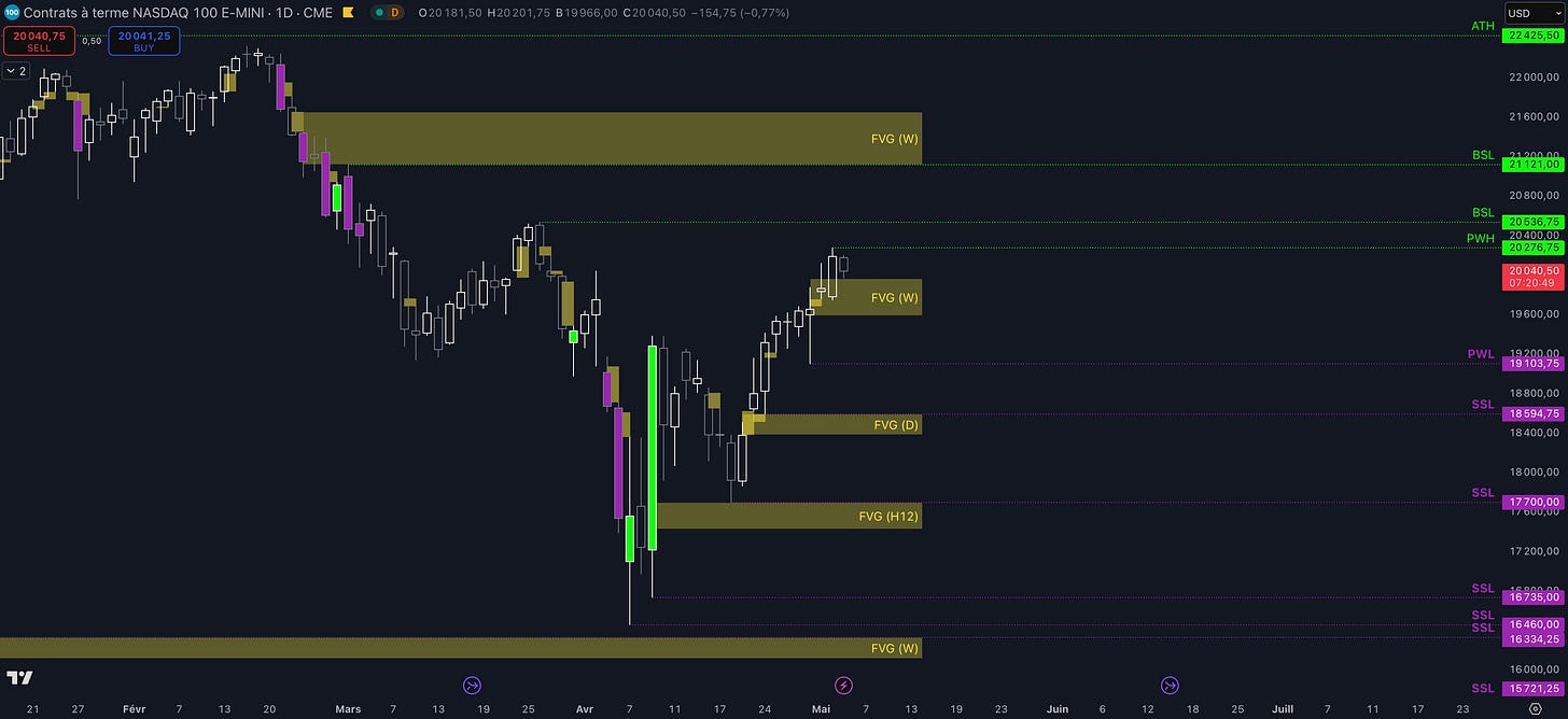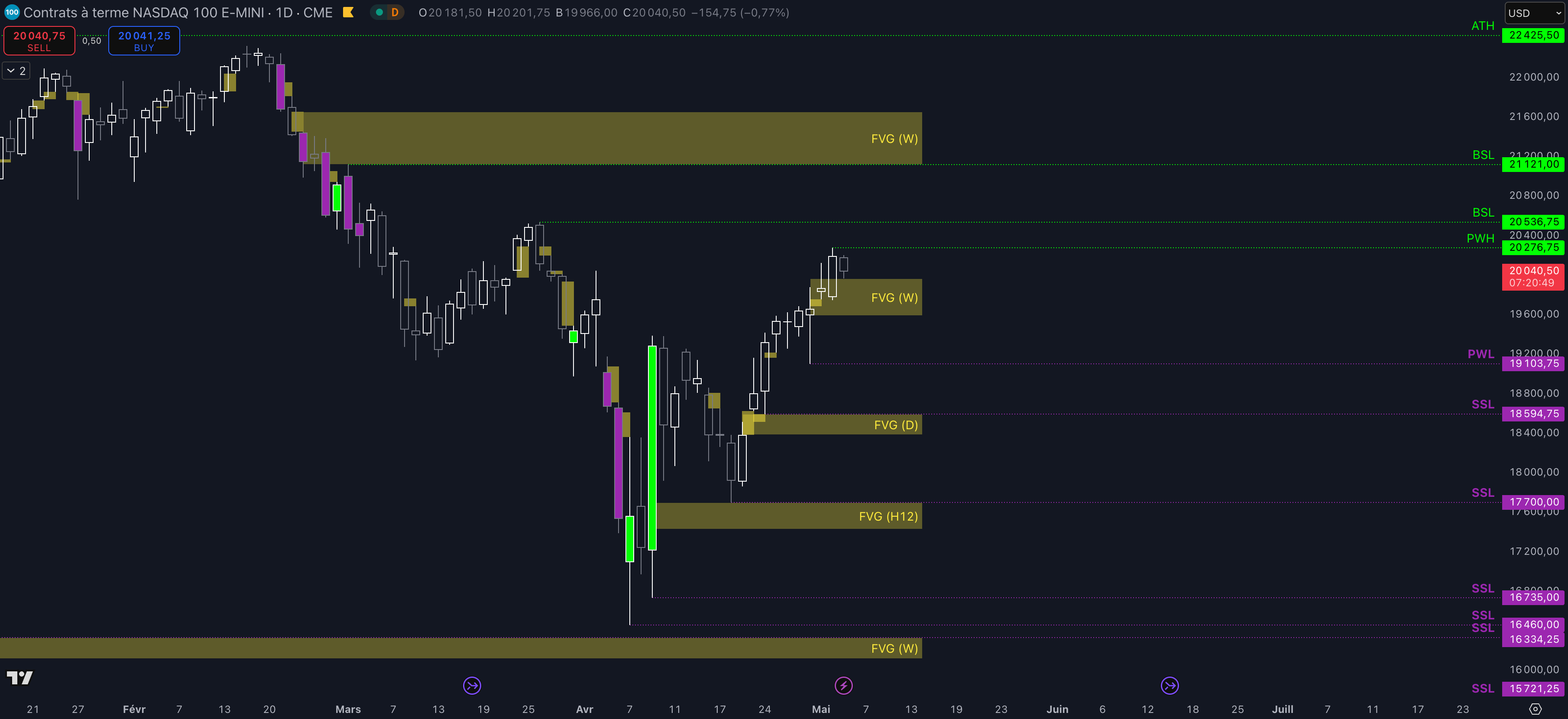 Tant que le Fair Value Gap (FVG) compris entre 19.962 $ et 19.594 $ est maintenu, c’est-à-dire qu’aucun clôture daily inférieure n’est validée, alors la dynamique restera haussière et les objectifs seront :