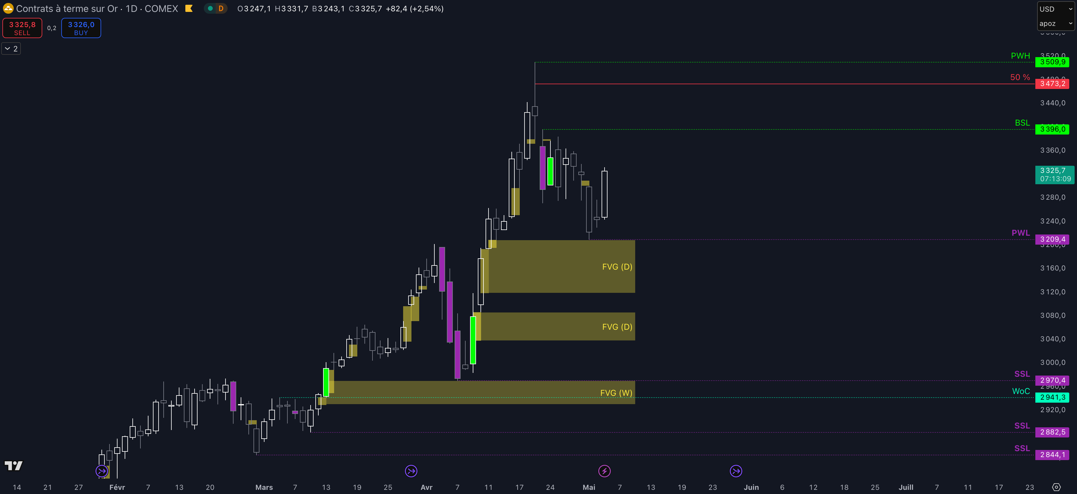 Le prix a récupéré les liquidités sous 3.270 $ et a clôturé sous 3.251 $ avant de former aussitôt un rebond en réintégrant les 3.251 $, donc la dynamique haussière demeure intacte mais la target N°1 n’a pas encore été atteinte.