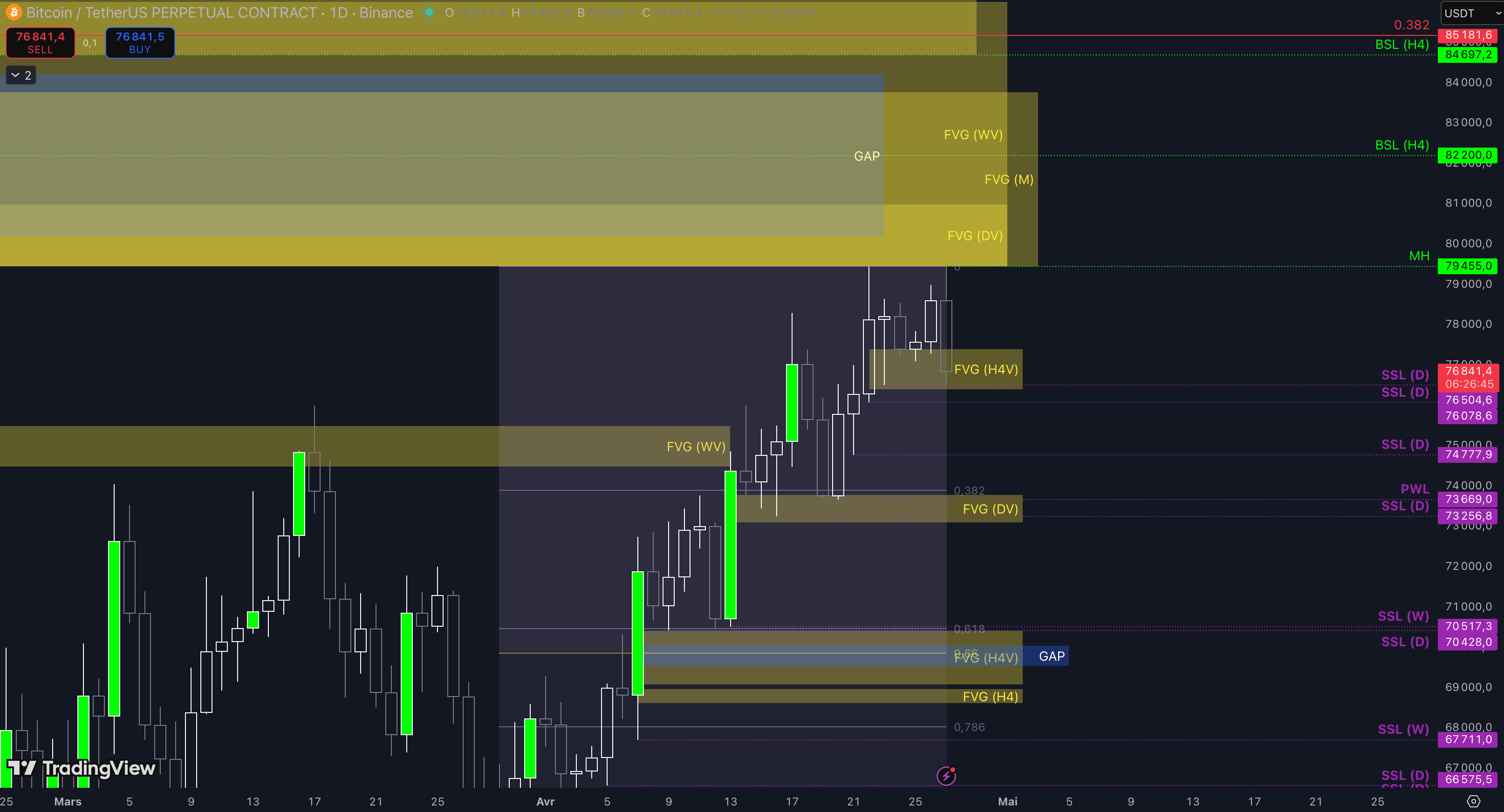 En revanche, si le niveau à 76.396 $ est cassé par une clôture daily inférieure sans réintégration haussière du niveau ensuite, alors la dynamique deviendra baissière à court terme seulement (car, en échelle plus large, tant que le BTC ne perd pas les 69.000 $, l’objectif de son retracement actuel demeure le rebalancing complet ou partiel de la zone étendue entre 80.000 $ et 89.000 $) et les objectifs seront :