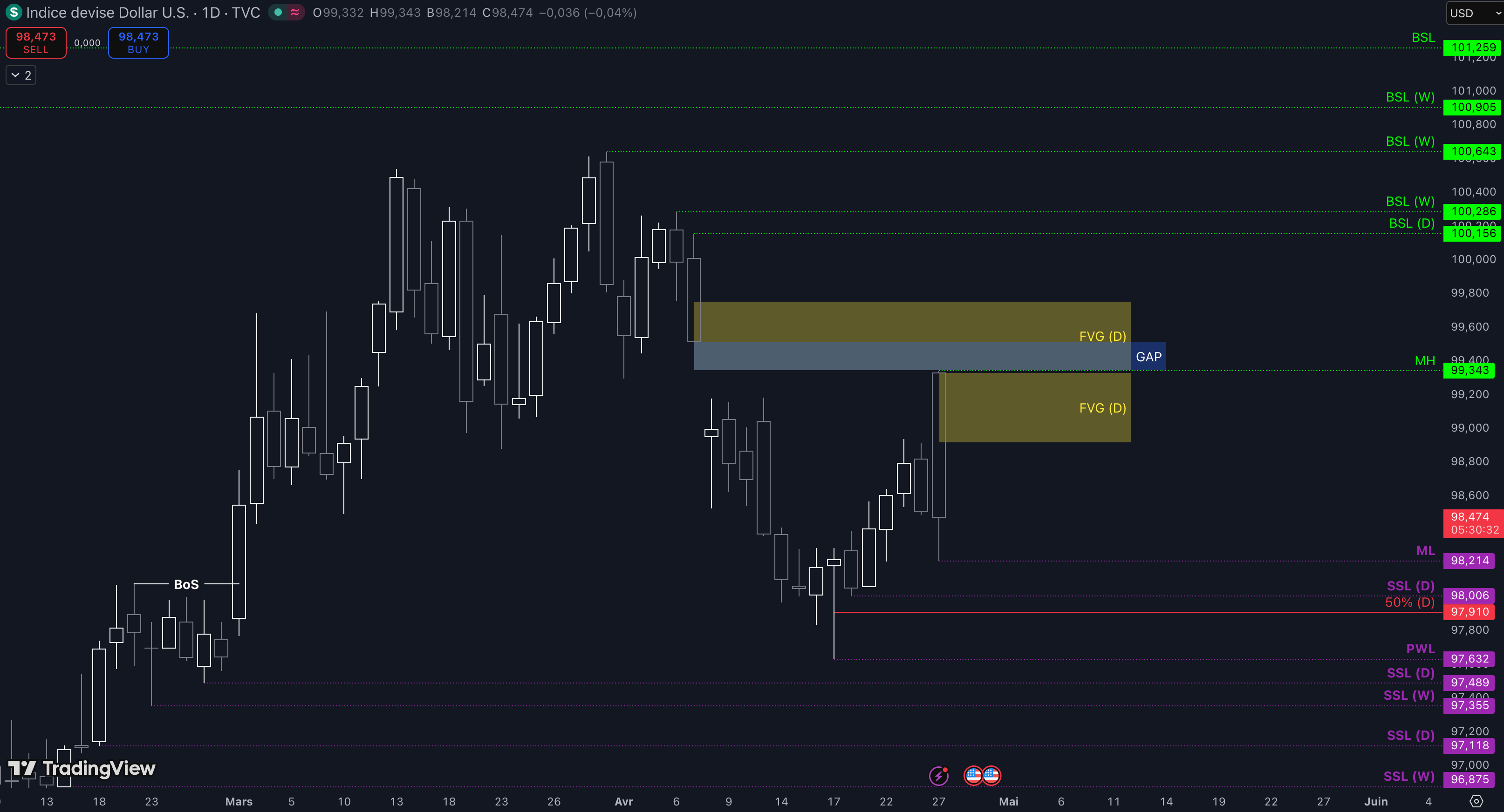 Puis, si aucun bottom ne se forme dans la zone précédente, alors le prochain objectif sera la poche de liquidités entre 98,00 $ et 97,91 $ (target N°2) ;