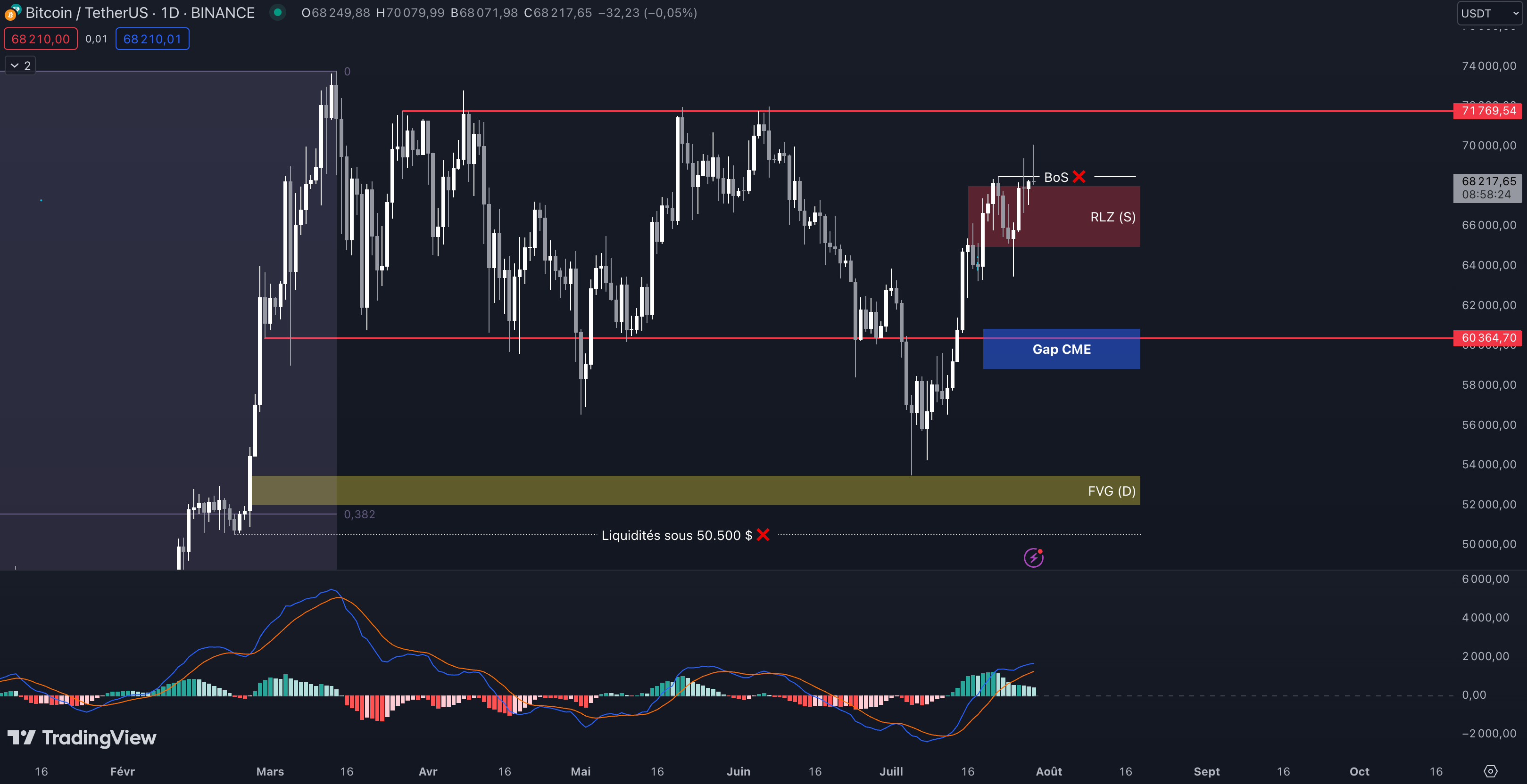 Tant que les 68.450 $ ne seront pas cassés et maintenus en daily, la probabilité de valider un potentiel double top au sein de la RLZ short augmentera.