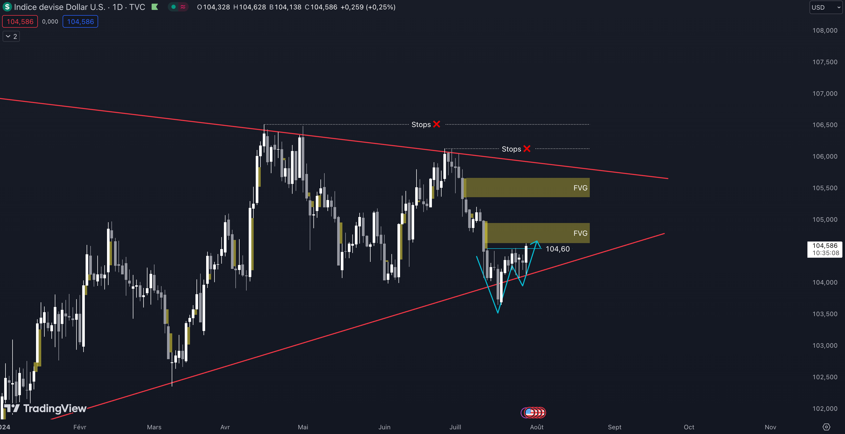 Les objectifs haussiers demeurent les deux zones d'inefficience (FVG) respectivement autour de 104,80 et 105,50 points.