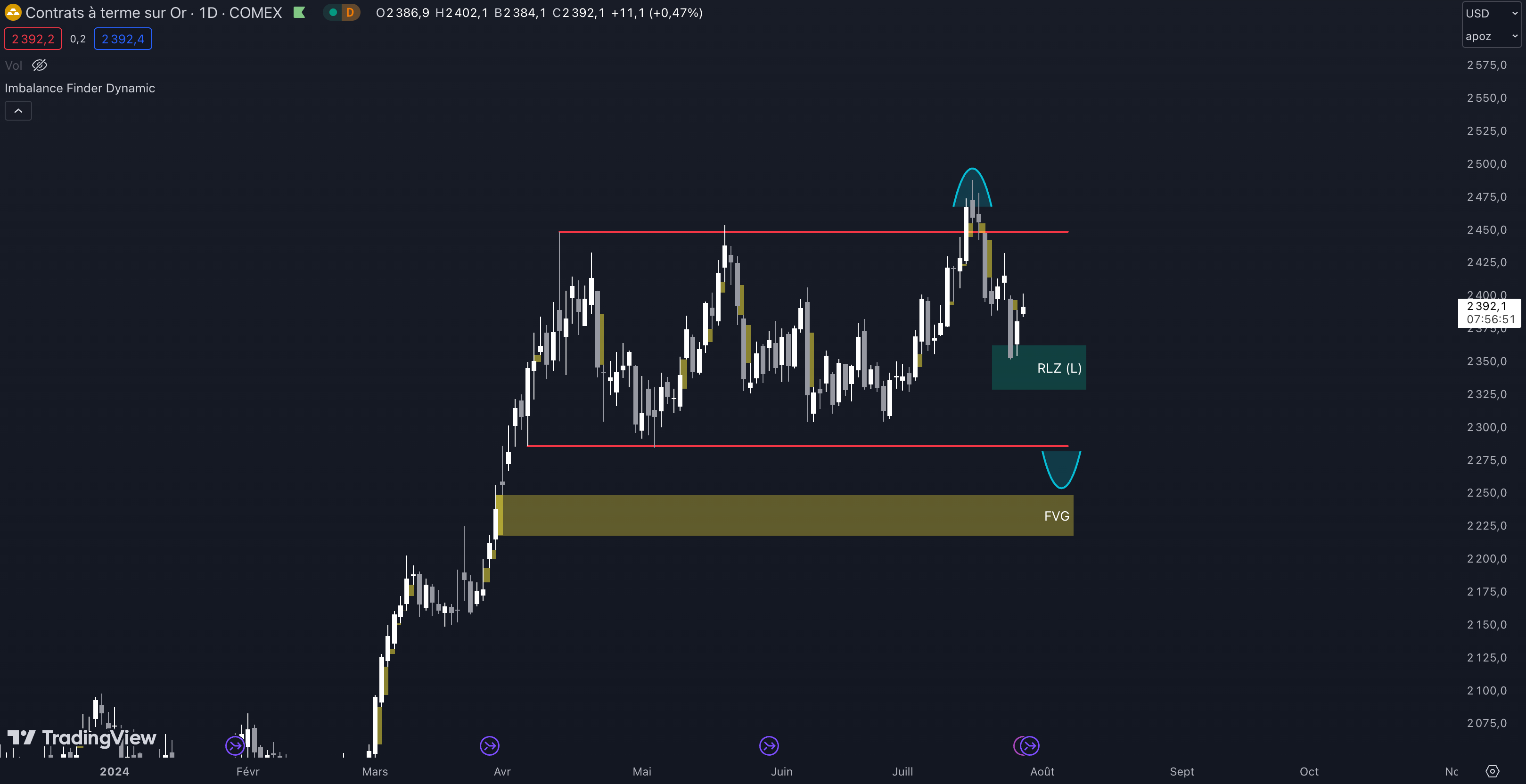 Après le fasle breakout du range au nord, la liquidité s’est accumulée au sud du range sous les 2.300 points qui demeure le prochain objectif pour le GOLD.